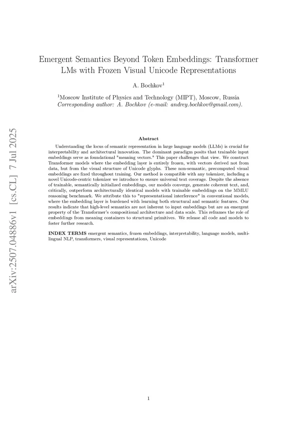 Emergent Semantics Beyond Token Embeddings: Transformer LMs with Frozen Visual Unicode Representations