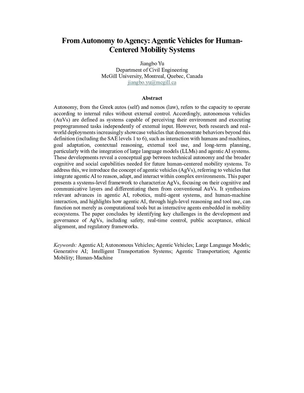 Autonomy, from the Greek autos (self) and nomos (law), refers to the capacity to operate according to internal rules without external control. Accordingly, autonomous vehicles (AuVs) are defined as systems capable of perceiving their environment and executing preprogrammed tasks independently of external input. However, both research and real-world deployments increasingly showcase vehicles that demonstrate behaviors beyond this definition (including the SAE levels 1 to 6), such as interaction with humans and machines, goal adaptation, contextual reasoning, external tool use, and long-term planning, particularly with the integration of large language models (LLMs) and agentic AI systems. These developments reveal a conceptual gap between technical autonomy and the broader cognitive and social capabilities needed for future human-centered mobility systems. To address this, we introduce the concept of agentic vehicles (AgVs), referring to vehicles that integrate agentic AI to reason, adapt, and interact within complex environments. This paper presents a systems-level framework to characterize AgVs, focusing on their cognitive and communicative layers and differentiating them from conventional AuVs. It synthesizes relevant advances in agentic AI, robotics, multi-agent systems, and human-machine interaction, and highlights how agentic AI, through high-level reasoning and tool use, can function not merely as computational tools but as interactive agents embedded in mobility ecosystems. The paper concludes by identifying key challenges in the development and governance of AgVs, including safety, real-time control, public acceptance, ethical alignment, and regulatory frameworks.