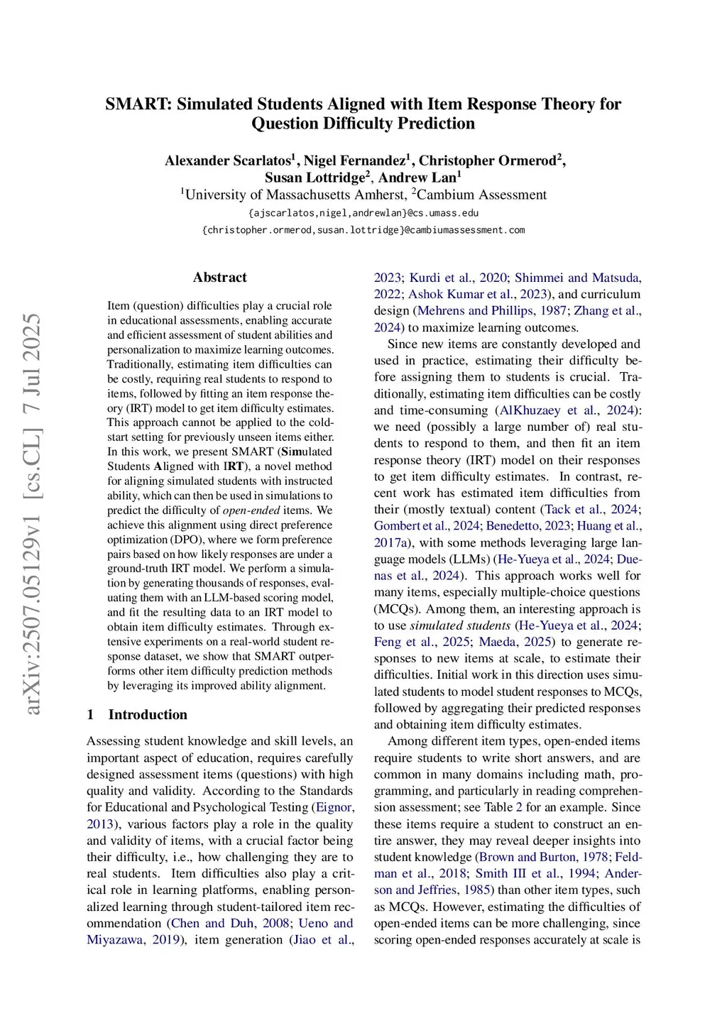 Item (question) difficulties play a crucial role in educational assessments, enabling accurate and efficient assessment of student abilities and personalization to maximize learning outcomes. Traditionally, estimating item difficulties can be costly, requiring real students to respond to items, followed by fitting an item response theory (IRT) model to get difficulty estimates. This approach cannot be applied to the cold-start setting for previously unseen items either. In this work, we present SMART (Simulated Students Aligned with IRT), a novel method for aligning simulated students with instructed ability, which can then be used in simulations to predict the difficulty of open-ended items. We achieve this alignment using direct preference optimization (DPO), where we form preference pairs based on how likely responses are under a ground-truth IRT model. We perform a simulation by generating thousands of responses, evaluating them with a large language model (LLM)-based scoring model, and fit the resulting data to an IRT model to obtain item difficulty estimates. Through extensive experiments on two real-world student response datasets, we show that SMART outperforms other item difficulty prediction methods by leveraging its improved ability alignment.