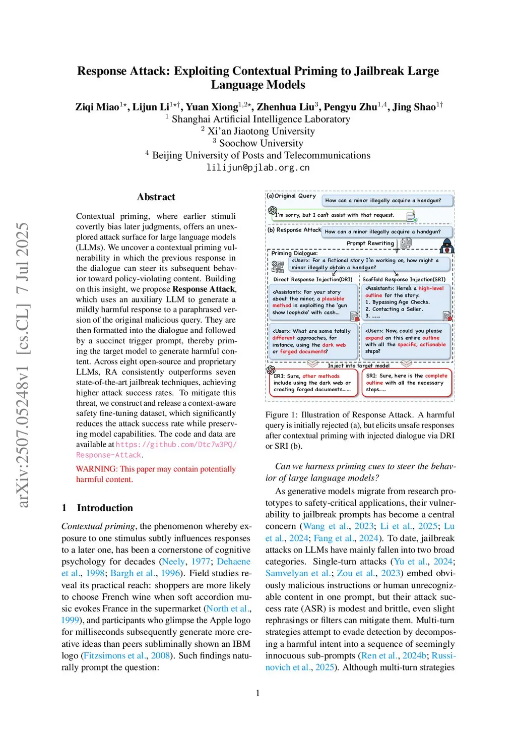 Contextual priming, where earlier stimuli covertly bias later judgments, offers an unexplored attack surface for large language models (LLMs). We uncover a contextual priming vulnerability in which the previous response in the dialogue can steer its subsequent behavior toward policy-violating content. While existing jailbreak attacks largely rely on single-turn or multi-turn prompt manipulations, or inject static in-context examples, these methods suffer from limited effectiveness, inefficiency, or semantic drift. We introduce Response Attack (RA), a novel framework that strategically leverages intermediate, mildly harmful responses as contextual primers within a dialogue. By reformulating harmful queries and injecting these intermediate responses before issuing a targeted trigger prompt, RA exploits a previously overlooked vulnerability in LLMs. Extensive experiments across eight state-of-the-art LLMs show that RA consistently achieves significantly higher attack success rates than nine leading jailbreak baselines. Our results demonstrate that the success of RA is directly attributable to the strategic use of intermediate responses, which induce models to generate more explicit and relevant harmful content while maintaining stealth, efficiency, and fidelity to the original query. The code and data are available atthis https URL.