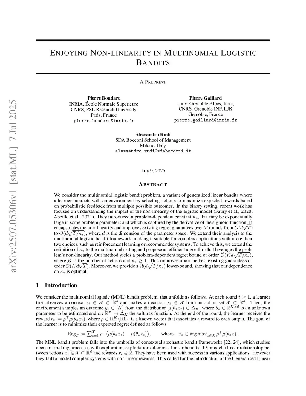 We consider the multinomial logistic bandit problem in which a learner interacts with an environment by selecting actions to maximize expected rewards based on probabilistic feedback from multiple possible outcomes. In the binary setting, recent work has focused on understanding the impact of the non-linearity of the logistic model (Faury et al., 2020; Abeille et al., 2021). They introduced a problem-dependent constant that may be exponentially large in some problem parameters and which is captured by the derivative of the sigmoid function. It encapsulates the non-linearity and improves existing regret guarantees over rounds from to , where is the dimension of the parameter space. We extend their analysis to the multinomial logistic bandit framework with a finite action space, making it suitable for complex applications with more than two choices, such as reinforcement learning or recommender systems. To achieve this, we extend the definition of $ \kappa_* $ to the multinomial setting and propose an efficient algorithm that leverages the problem's non-linearity. Our method yields a problem-dependent regret bound of order $ \smash{\widetilde{\mathcal{O}}( R d \sqrt{ {KT}/{\kappa_*}} ) } $, where denotes the norm of the vector of rewards and is the number of outcomes. This improves upon the best existing guarantees of order $ \smash{\widetilde{\mathcal{O}}( RdK \sqrt{T} )}$. Moreover, we provide a matching lower-bound, showing that our algorithm is minimax-optimal and that our definition of is optimal.