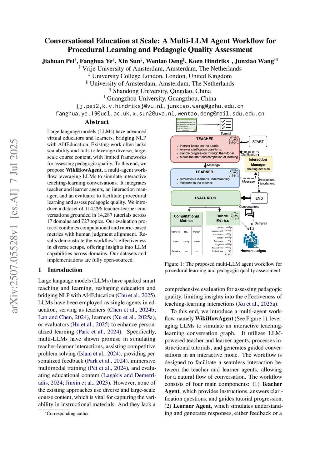 Large language models (LLMs) have advanced virtual educators and learners, bridging NLP with AI4Education. Existing work often lacks scalability and fails to leverage diverse, large-scale course content, with limited frameworks for assessing pedagogic quality. To this end, we propose WikiHowAgent, a multi-agent workflow leveraging LLMs to simulate interactive teaching-learning conversations. It integrates teacher and learner agents, an interaction manager, and an evaluator to facilitate procedural learning and assess pedagogic quality. We introduce a dataset of 114,296 teacher-learner conversations grounded in 14,287 tutorials across 17 domains and 727 topics. Our evaluation protocol combines computational and rubric-based metrics with human judgment alignment. Results demonstrate the workflow's effectiveness in diverse setups, offering insights into LLM capabilities across domains. Our datasets and implementations are fully open-sourced.