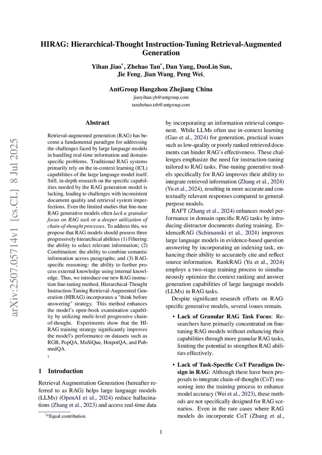 Retrieval-augmented generation (RAG) has become a fundamental paradigm for addressing the challenges faced by large language models in handling real-time information and domain-specific problems. Traditional RAG systems primarily rely on the in-context learning (ICL) capabilities of the large language model itself. Still, in-depth research on the specific capabilities needed by the RAG generation model is lacking, leading to challenges with inconsistent document quality and retrieval system imperfections. Even the limited studies that fine-tune RAG generative models often \textit{lack a granular focus on RAG task} or \textit{a deeper utilization of chain-of-thought processes}. To address this, we propose that RAG models should possess three progressively hierarchical abilities (1) Filtering: the ability to select relevant information; (2) Combination: the ability to combine semantic information across paragraphs; and (3) RAG-specific reasoning: the ability to further process external knowledge using internal knowledge. Thus, we introduce our new RAG instruction fine-tuning method, Hierarchical-Thought Instruction-Tuning Retrieval-Augmented Generation (HIRAG) incorporates a "think before answering" strategy. This method enhances the model's open-book examination capability by utilizing multi-level progressive chain-of-thought. Experiments show that the HIRAG training strategy significantly improves the model's performance on datasets such as RGB, PopQA, MuSiQue, HotpotQA, and PubmedQA.