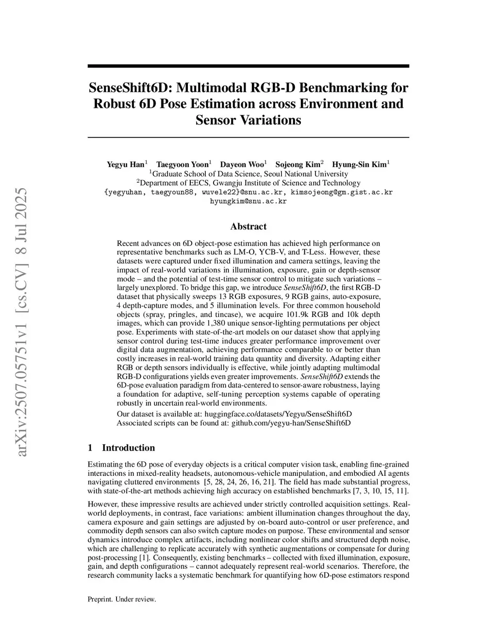 Recent advances on 6D object-pose estimation have achieved high performance on representative benchmarks such as LM-O, YCB-V, and T-Less. However, these datasets were captured under fixed illumination and camera settings, leaving the impact of real-world variations in illumination, exposure, gain or depth-sensor mode-and the potential of test-time sensor control to mitigate such variations-largely unexplored. To bridge this gap, we introduce SenseShift6D, the first RGB-D dataset that physically sweeps 13 RGB exposures, 9 RGB gains, auto-exposure, 4 depth-capture modes, and 5 illumination levels. For five common household objects (spray, pringles, tincase, sandwich, and mouse), we acquire 166.4k RGB and 16.7k depth images, which can provide 1,380 unique sensor-lighting permutations per object pose. Experiments with state-of-the-art models on our dataset demonstrate that applying multimodal sensor control at test time yields substantial performance gains, achieving a 19.5 pp improvement on pretrained generalizable models. It also enhances robustness precisely where those models tend to fail. Moreover, even instance-level pose estimators, where train and test set share identical object and background, performance still varies under environmental and sensor change, demonstrating that test-time sensor control remains effective compared to costly expansions in the quantity and diversity of real-world training data, without any additional training. SenseShift6D extends the object pose evaluation paradigm from data-centered to sensor-aware robustness, laying a foundation for adaptive, self-tuning perception systems capable of operating robustly in uncertain real-world environments.