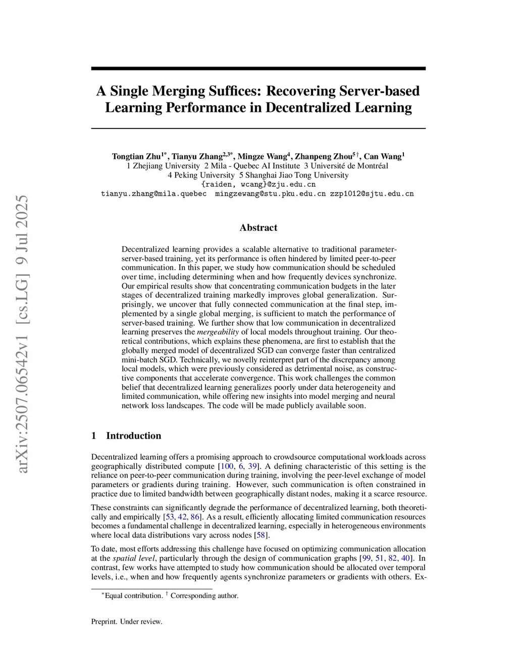 Decentralized learning provides a scalable alternative to parameter-server-based training, yet its performance is often hindered by limited peer-to-peer communication. In this paper, we study how communication should be scheduled over time, including determining when and how frequently devices synchronize. Counterintuitive empirical results show that concentrating communication budgets in the later stages of decentralized training remarkably improves global test performance. Surprisingly, we uncover that fully connected communication at the final step, implemented by a single global merging, can significantly improve the performance of decentralized learning under high data heterogeneity. Our theoretical contributions, which explain these phenomena, are the first to establish that the globally merged model of decentralized SGD can match the convergence rate of parallel SGD. Technically, we reinterpret part of the discrepancy among local models, which were previously considered as detrimental noise, as constructive components essential for matching this rate. This work provides evidence that decentralized learning is able to generalize under high data heterogeneity and limited communication, while offering broad new avenues for model merging research.