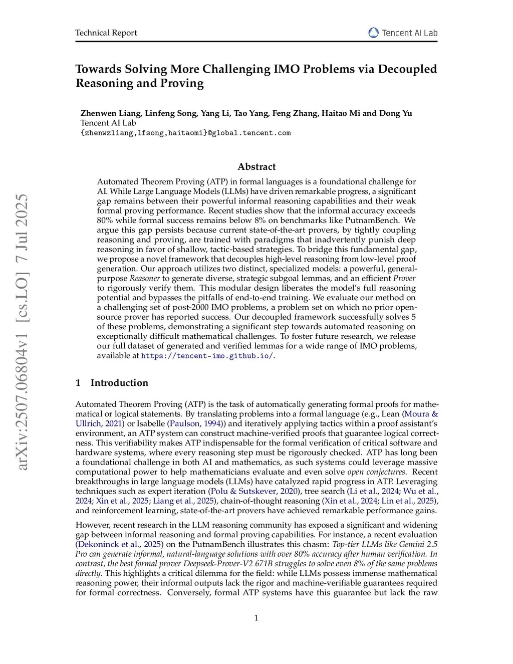 Automated Theorem Proving (ATP) in formal languages is a foundational challenge for AI. While Large Language Models (LLMs) have driven remarkable progress, a significant gap remains between their powerful informal reasoning capabilities and their weak formal proving performance. Recent studies show that the informal accuracy exceeds 80% while formal success remains below 8% on benchmarks like PutnamBench. We argue this gap persists because current state-of-the-art provers, by tightly coupling reasoning and proving, are trained with paradigms that inadvertently punish deep reasoning in favor of shallow, tactic-based strategies. To bridge this fundamental gap, we propose a novel framework that decouples high-level reasoning from low-level proof generation. Our approach utilizes two distinct, specialized models: a powerful, general-purpose Reasoner to generate diverse, strategic subgoal lemmas, and an efficient Prover to rigorously verify them. This modular design liberates the model's full reasoning potential and bypasses the pitfalls of end-to-end training. We evaluate our method on a challenging set of post-2000 IMO problems, a problem set on which no prior open-source prover has reported success. Our decoupled framework successfully solves 5 of these problems, demonstrating a significant step towards automated reasoning on exceptionally difficult mathematical challenges. To foster future research, we release our full dataset of generated and verified lemmas for a wide range of IMO problems, available atthis https URL.