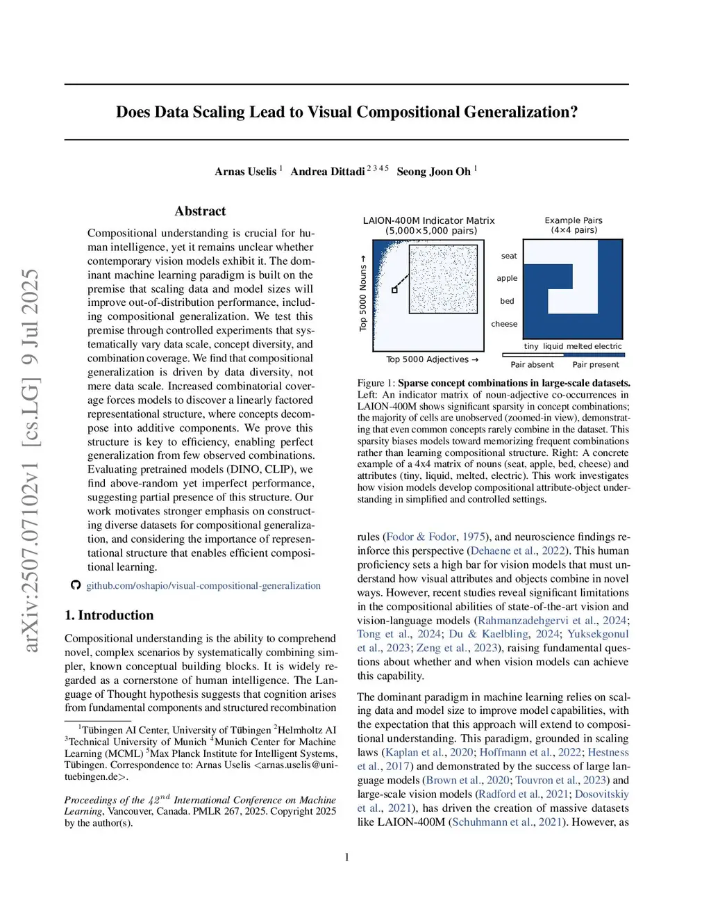 Compositional understanding is crucial for human intelligence, yet it remains unclear whether contemporary vision models exhibit it. The dominant machine learning paradigm is built on the premise that scaling data and model sizes will improve out-of-distribution performance, including compositional generalization. We test this premise through controlled experiments that systematically vary data scale, concept diversity, and combination coverage. We find that compositional generalization is driven by data diversity, not mere data scale. Increased combinatorial coverage forces models to discover a linearly factored representational structure, where concepts decompose into additive components. We prove this structure is key to efficiency, enabling perfect generalization from few observed combinations. Evaluating pretrained models (DINO, CLIP), we find above-random yet imperfect performance, suggesting partial presence of this structure. Our work motivates stronger emphasis on constructing diverse datasets for compositional generalization, and considering the importance of representational structure that enables efficient compositional learning. Code available atthis https URL.