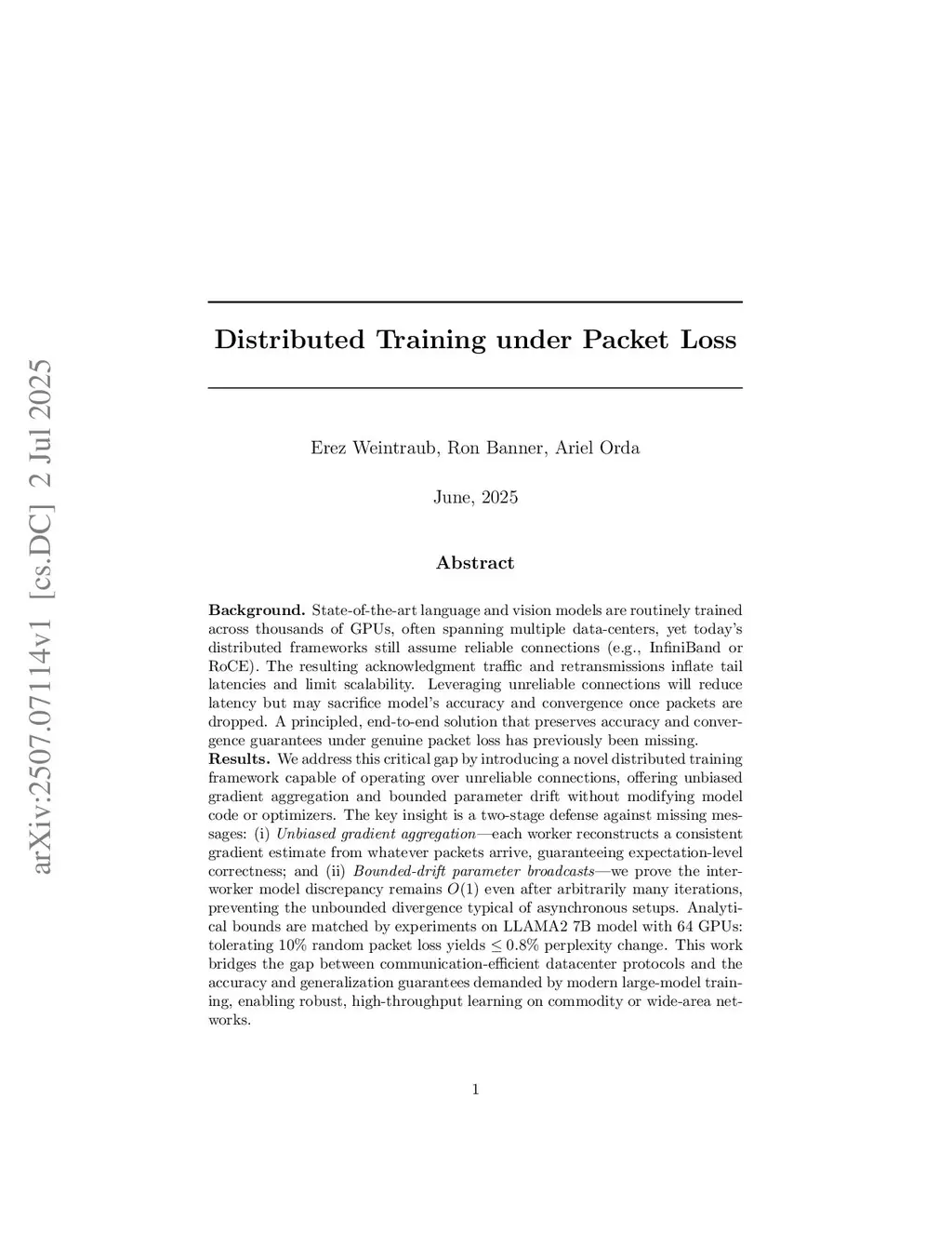 State-of-the-art language and vision models are routinely trained across thousands of GPUs, often spanning multiple data-centers, yet today's distributed frameworks still assume reliable connections (e.g., InfiniBand or RoCE). The resulting acknowledgment traffic and retransmissions inflate tail latencies and limit scalability. Leveraging unreliable connections will reduce latency but may sacrifice model accuracy and convergence once packets are dropped. A principled, end-to-end solution that preserves accuracy and convergence guarantees under genuine packet loss has previously been missing. We address this critical gap by introducing a novel distributed training framework capable of operating over unreliable connections, offering unbiased gradient aggregation and bounded parameter drift without modifying model code or optimizers. The key insight is a two-stage defense against missing messages: (i) Unbiased gradient aggregation: each worker reconstructs a consistent gradient estimate from whatever packets arrive, guaranteeing expectation-level correctness; and (ii) Bounded-drift parameter broadcasts: we prove the inter-worker model discrepancy remains O(1) even after arbitrarily many iterations, preventing the unbounded divergence typical of asynchronous setups. Analytical bounds are matched by experiments on the LLAMA2 7B model with 64 GPUs: tolerating 10% random packet loss yields at most 0.8% perplexity change. This work bridges the gap between communication-efficient datacenter protocols and the accuracy and generalization guarantees demanded by modern large-model training, enabling robust, high-throughput learning on commodity or wide-area networks.
