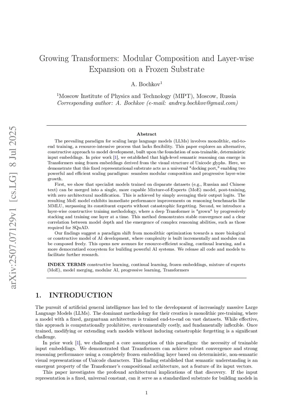 The prevailing paradigm for scaling large language models (LLMs) involves monolithic, end-to-end training, a resource-intensive process that lacks flexibility. This paper explores an alternative, constructive scaling paradigm, enabled by the principle of emergent semantics in Transformers with frozen, non-semantic input embeddings. We posit that because high-level meaning is a compositional property of a Transformer's deep layers, not its input vectors, the embedding layer and trained lower layers can serve as a fixed foundation. This liberates backpropagation to focus solely on newly added components, making incremental growth viable. We operationalize this with a layer-wise constructive methodology that combines strict layer freezing in early stages with efficient, holistic fine-tuning of the entire model stack via low-rank adaptation (LoRA) as complexity increases. This method not only demonstrates stable convergence but also reveals a direct correlation between model depth and the emergence of complex reasoning abilities, such as those required for SQuAD, which are absent in shallower models. In a controlled study, our constructively grown model rivals the performance of a monolithically trained baseline of the same size, validating the efficiency and efficacy of the approach. Our findings suggest a path towards a paradigm shift from monolithic optimization towards a more biological or constructive model of AI development. This opens a path for more resource-efficient scaling, continual learning, and a more modular approach to building powerful AI systems. We release all code and models to facilitate further research.