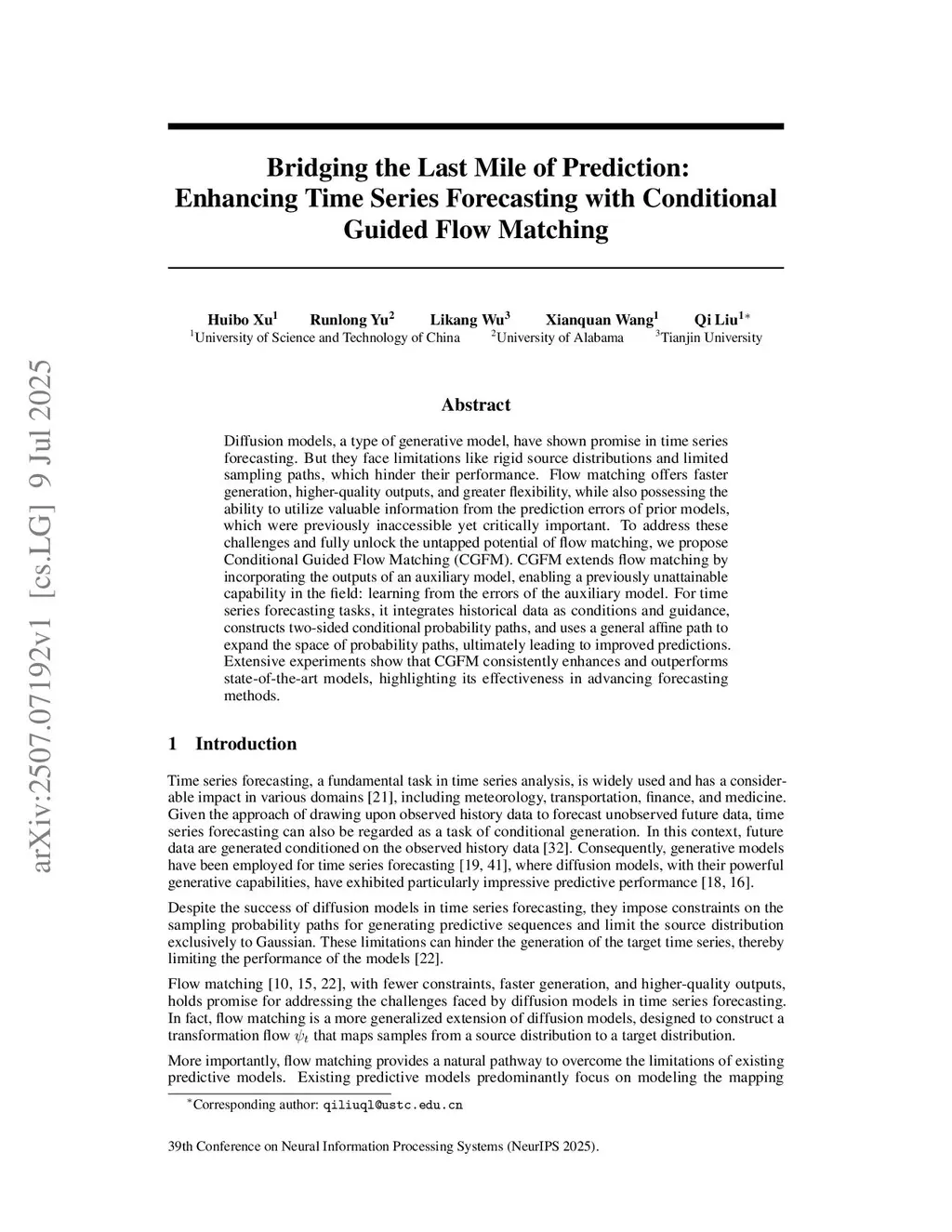 Existing generative models for time series forecasting often transform simple priors (typically Gaussian) into complex data distributions. However, their sampling initialization, independent of historical data, hinders the capture of temporal dependencies, limiting predictive accuracy. They also treat residuals merely as optimization targets, ignoring that residuals often exhibit meaningful patterns like systematic biases or nontrivial distributional structures. To address these, we propose Conditional Guided Flow Matching (CGFM), a novel model-agnostic framework that extends flow matching by integrating outputs from an auxiliary predictive model. This enables learning from the probabilistic structure of prediction residuals, leveraging the auxiliary model's prediction distribution as a source to reduce learning difficulty and refine forecasts. CGFM incorporates historical data as both conditions and guidance, uses two-sided conditional paths (with source and target conditioned on the same history), and employs affine paths to expand the path space, avoiding path crossing without complex mechanisms, preserving temporal consistency, and strengthening distribution alignment. Experiments across datasets and baselines show CGFM consistently outperforms state-of-the-art models, advancing forecasting.