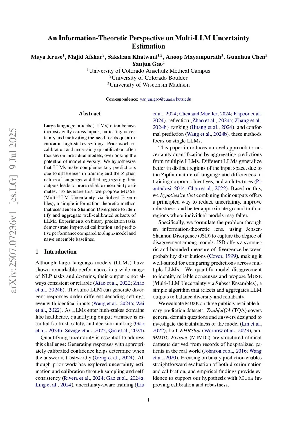 Large language models (LLMs) often behave inconsistently across inputs, indicating uncertainty and motivating the need for its quantification in high-stakes settings. Prior work on calibration and uncertainty quantification often focuses on individual models, overlooking the potential of model diversity. We hypothesize that LLMs make complementary predictions due to differences in training and the Zipfian nature of language, and that aggregating their outputs leads to more reliable uncertainty estimates. To leverage this, we propose MUSE (Multi-LLM Uncertainty via Subset Ensembles), a simple information-theoretic method that uses Jensen-Shannon Divergence to identify and aggregate well-calibrated subsets of LLMs. Experiments on binary prediction tasks demonstrate improved calibration and predictive performance compared to single-model and naïve ensemble baselines. In addition, we explore using MUSE as guided signals with chain-of-thought distillation to fine-tune LLMs for calibration. MUSE is available at:this https URL.