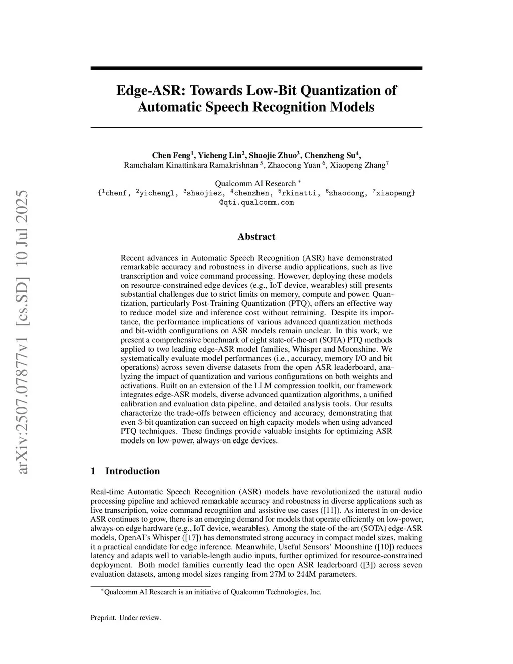 Recent advances in Automatic Speech Recognition (ASR) have demonstrated remarkable accuracy and robustness in diverse audio applications, such as live transcription and voice command processing. However, deploying these models on resource-constrained edge devices (e.g., IoT device, wearables) still presents substantial challenges due to strict limits on memory, compute and power. Quantization, particularly Post-Training Quantization (PTQ), offers an effective way to reduce model size and inference cost without retraining. Despite its importance, the performance implications of various advanced quantization methods and bit-width configurations on ASR models remain unclear. In this work, we present a comprehensive benchmark of eight state-of-the-art (SOTA) PTQ methods applied to two leading edge-ASR model families, Whisper and Moonshine. We systematically evaluate model performances (i.e., accuracy, memory I/O and bit operations) across seven diverse datasets from the open ASR leader-board, analyzing the impact of quantization and various configurations on both weights and activations. Built on an extension of the LLM compression toolkit, our framework integrates edge-ASR models, diverse advanced quantization algorithms, a unified calibration and evaluation data pipeline, with detailed analysis tools. Our results characterize the trade-offs between efficiency and accuracy, demonstrating that even -bit quantization can succeed on high capacity models when using advanced PTQ techniques. These findings provide valuable insights for optimizing ASR models on low-power, always-on edge devices.