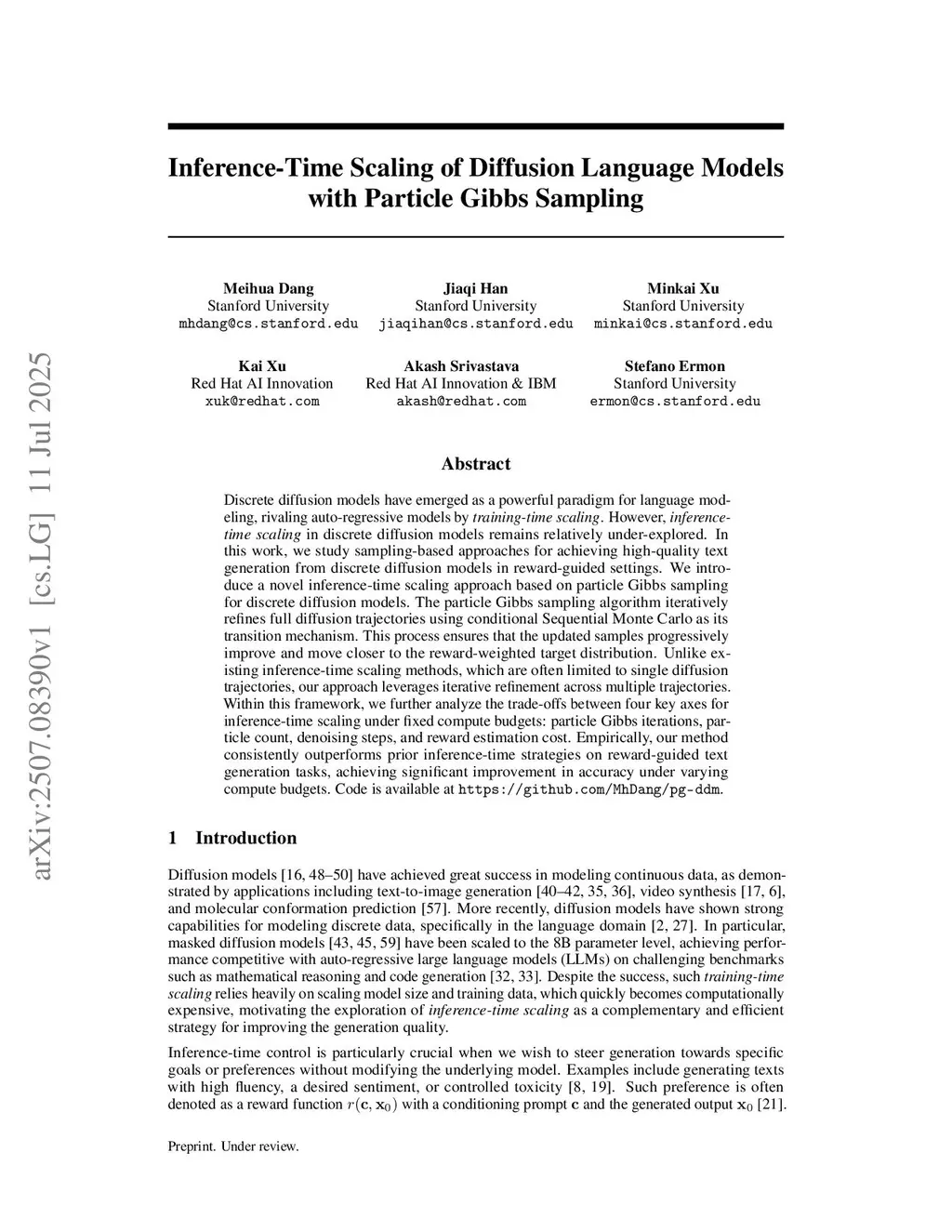 Discrete diffusion models have recently emerged as strong alternatives to autoregressive language models, matching their performance through large-scale training. However, inference-time control remains relatively underexplored. In this work, we study how to steer generation toward desired rewards without retraining the models. Prior methods typically resample or filter within a single denoising trajectory, optimizing rewards step-by-step without trajectory-level refinement. We introduce particle Gibbs sampling for diffusion language models (PG-DLM), a novel inference-time algorithm enabling trajectory-level refinement while preserving generation perplexity under reward optimization. PG-DLM constructs a Markov chain over full denoising trajectories and applies a conditional sequential Monte Carlo kernel to resample them. We derive theoretical guarantees for convergence, including asymptotic consistency and variance bounds. Within this framework, we further analyze trade-offs across four key axes for inference-time scaling under fixed budgets: iterations, samples, denoising steps, and reward estimation. Our analysis shows scaling iterations achieves the best reward-perplexity trade-off. Empirically, PG-DLM consistently outperforms prior methods using MDLM and LLaDA-8B as base models across a wide range of compute budgets for reward-guided generation tasks including toxicity and sentiment control as well as linguistic acceptability.