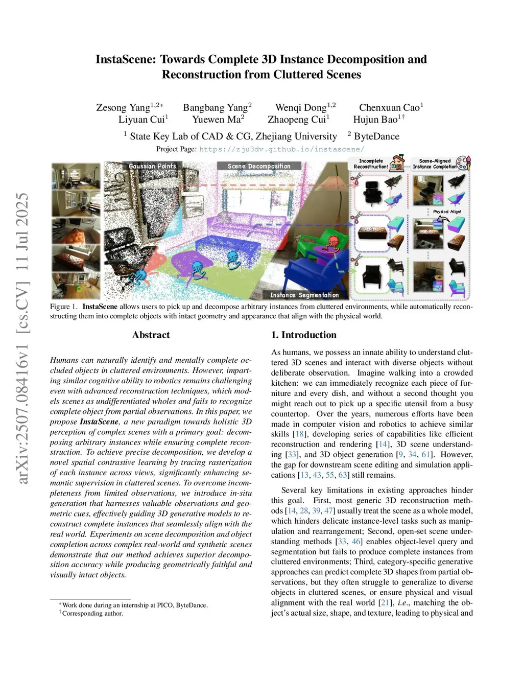 Humans can naturally identify and mentally complete occluded objects in cluttered environments. However, imparting similar cognitive ability to robotics remains challenging even with advanced reconstruction techniques, which models scenes as undifferentiated wholes and fails to recognize complete object from partial observations. In this paper, we propose InstaScene, a new paradigm towards holistic 3D perception of complex scenes with a primary goal: decomposing arbitrary instances while ensuring complete reconstruction. To achieve precise decomposition, we develop a novel spatial contrastive learning by tracing rasterization of each instance across views, significantly enhancing semantic supervision in cluttered scenes. To overcome incompleteness from limited observations, we introduce in-situ generation that harnesses valuable observations and geometric cues, effectively guiding 3D generative models to reconstruct complete instances that seamlessly align with the real world. Experiments on scene decomposition and object completion across complex real-world and synthetic scenes demonstrate that our method achieves superior decomposition accuracy while producing geometrically faithful and visually intact objects.