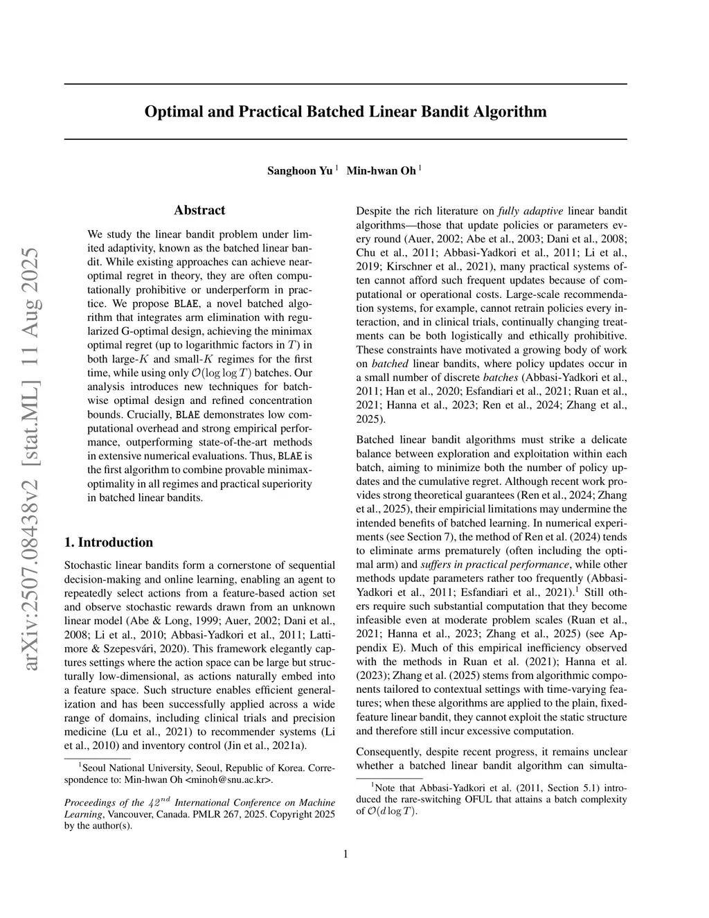 We study the linear bandit problem under limited adaptivity, known as the batched linear bandit. While existing approaches can achieve near-optimal regret in theory, they are often computationally prohibitive or underperform in practice. We propose \texttt{BLAE}, a novel batched algorithm that integrates arm elimination with regularized G-optimal design, achieving the minimax optimal regret (up to logarithmic factors in ) in both large- and small- regimes for the first time, while using only batches. Our analysis introduces new techniques for batch-wise optimal design and refined concentration bounds. Crucially, \texttt{BLAE} demonstrates low computational overhead and strong empirical performance, outperforming state-of-the-art methods in extensive numerical evaluations. Thus, \texttt{BLAE} is the first algorithm to combine provable minimax-optimality in all regimes and practical superiority in batched linear bandits.