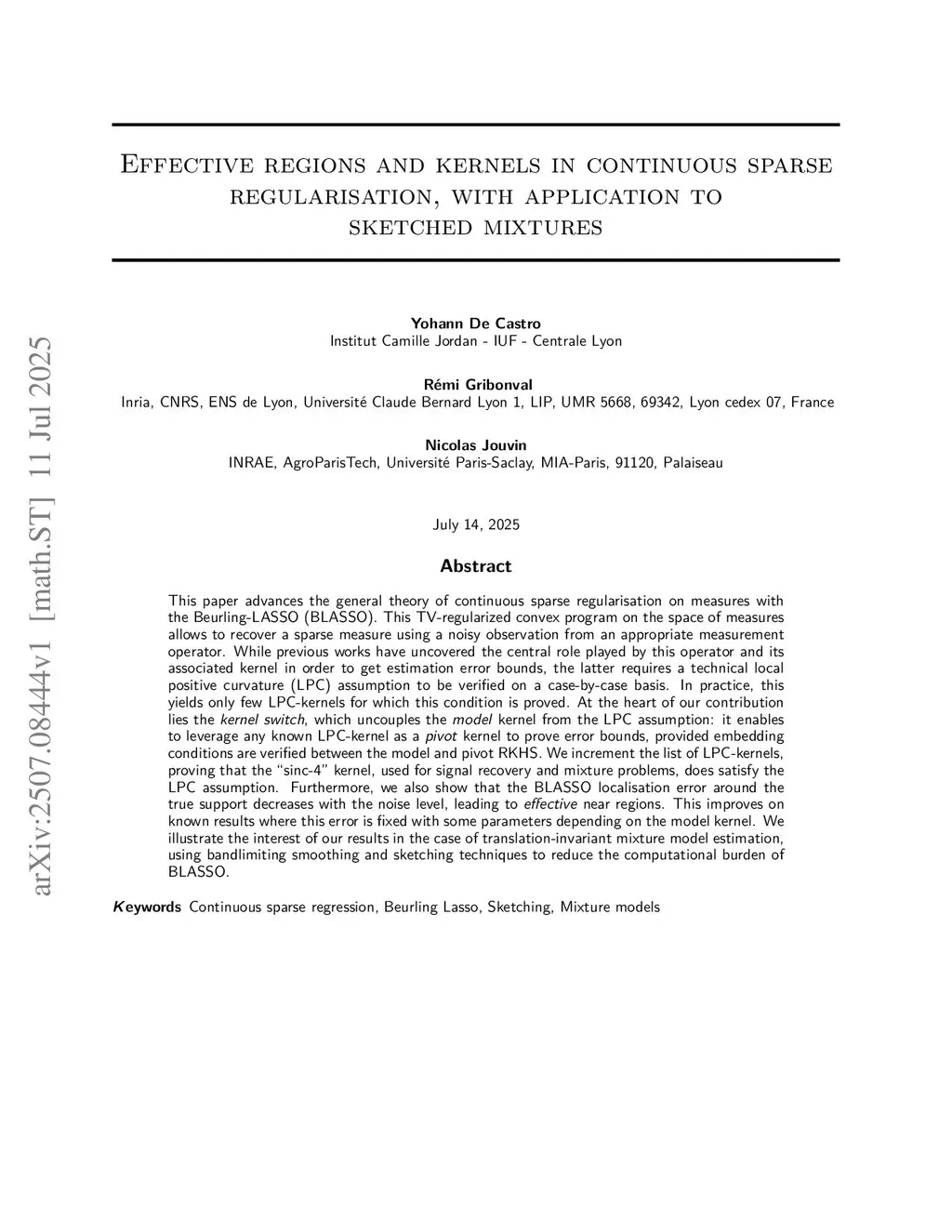 Effective regions and kernels in continuous sparse regularisation, with application to sketched mixtures