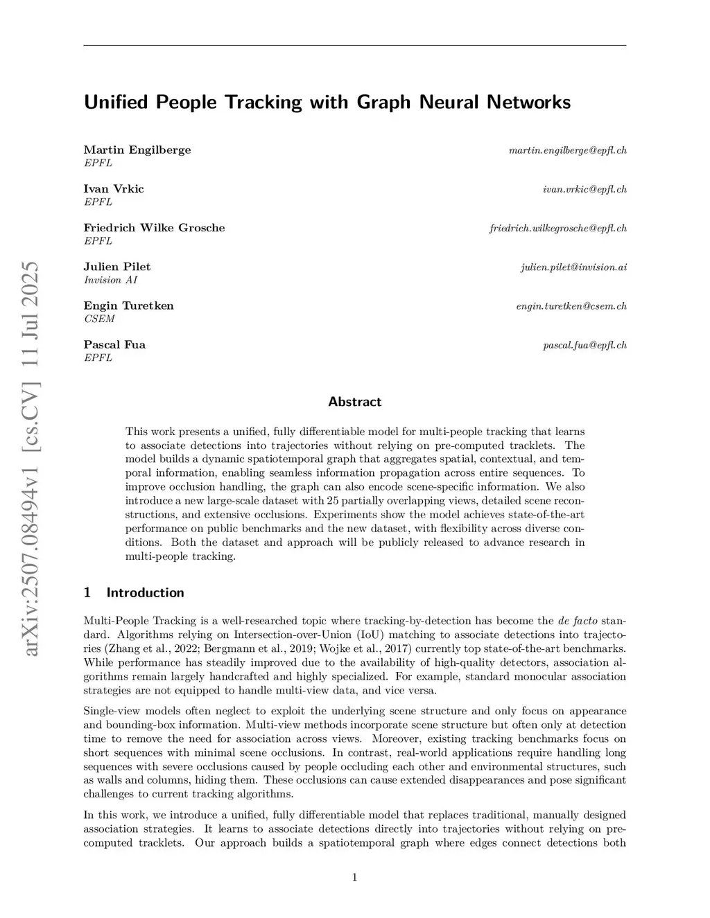 This work presents a unified, fully differentiable model for multi-people tracking that learns to associate detections into trajectories without relying on pre-computed tracklets. The model builds a dynamic spatiotemporal graph that aggregates spatial, contextual, and temporal information, enabling seamless information propagation across entire sequences. To improve occlusion handling, the graph can also encode scene-specific information. We also introduce a new large-scale dataset with 25 partially overlapping views, detailed scene reconstructions, and extensive occlusions. Experiments show the model achieves state-of-the-art performance on public benchmarks and the new dataset, with flexibility across diverse conditions. Both the dataset and approach will be publicly released to advance research in multi-people tracking.