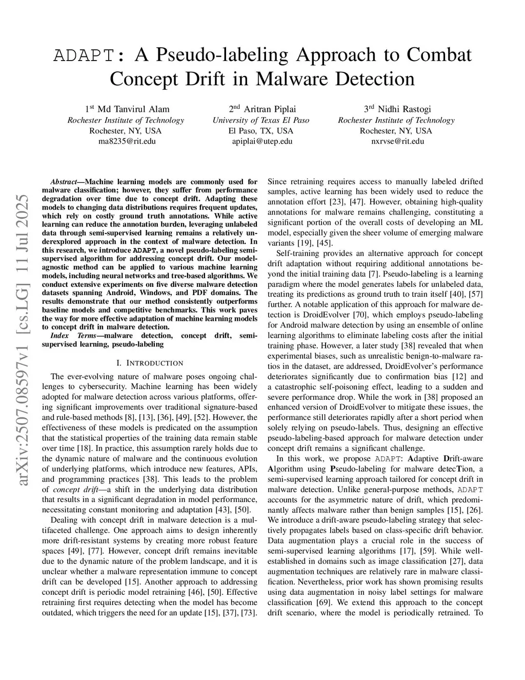 Machine learning models are commonly used for malware classification; however, they suffer from performance degradation over time due to concept drift. Adapting these models to changing data distributions requires frequent updates, which rely on costly ground truth annotations. While active learning can reduce the annotation burden, leveraging unlabeled data through semi-supervised learning remains a relatively underexplored approach in the context of malware detection. In this research, we introduce \texttt{ADAPT}, a novel pseudo-labeling semi-supervised algorithm for addressing concept drift. Our model-agnostic method can be applied to various machine learning models, including neural networks and tree-based algorithms. We conduct extensive experiments on five diverse malware detection datasets spanning Android, Windows, and PDF domains. The results demonstrate that our method consistently outperforms baseline models and competitive benchmarks. This work paves the way for more effective adaptation of machine learning models to concept drift in malware detection.