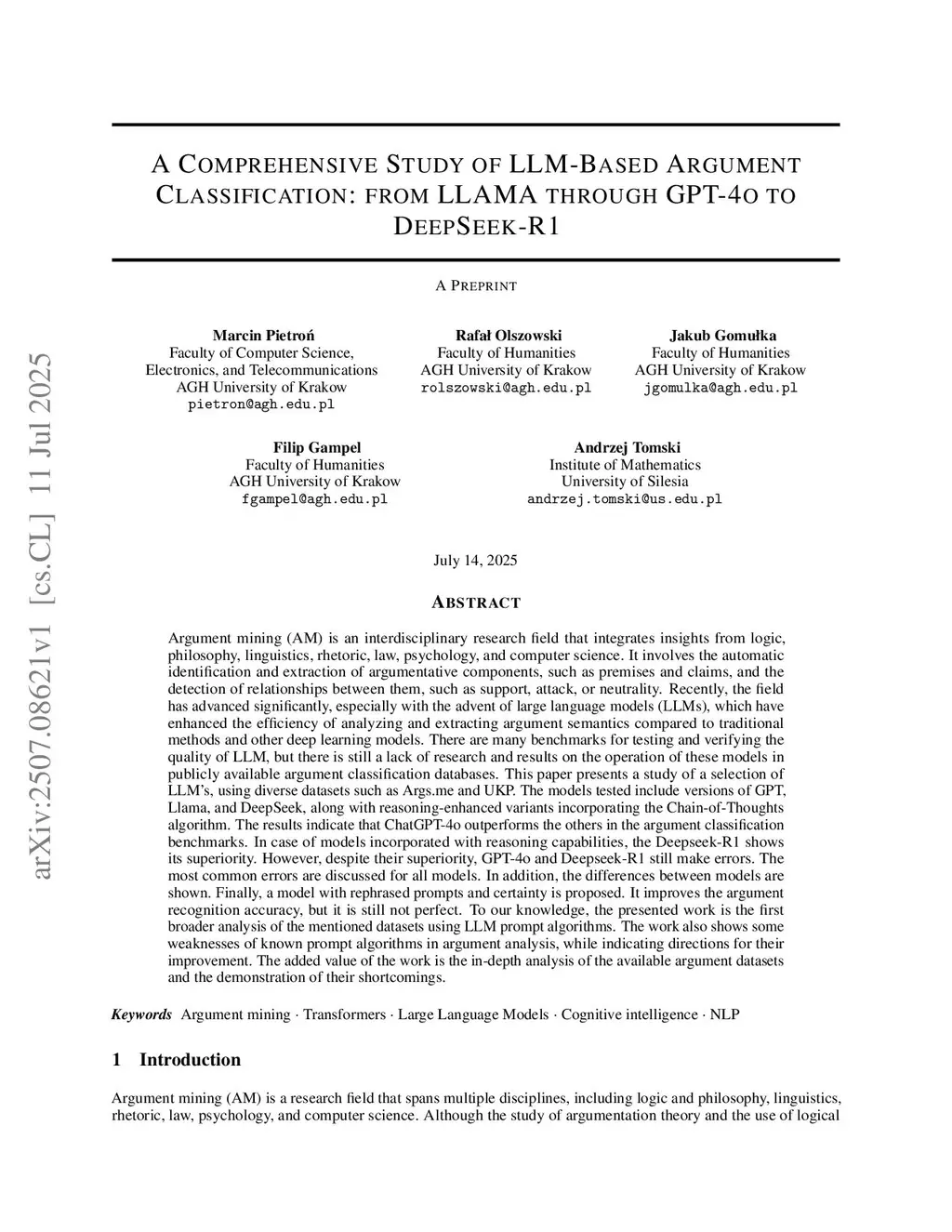 A comprehensive study of LLM-based argument classification: from LLAMA through GPT-4o to Deepseek-R1
