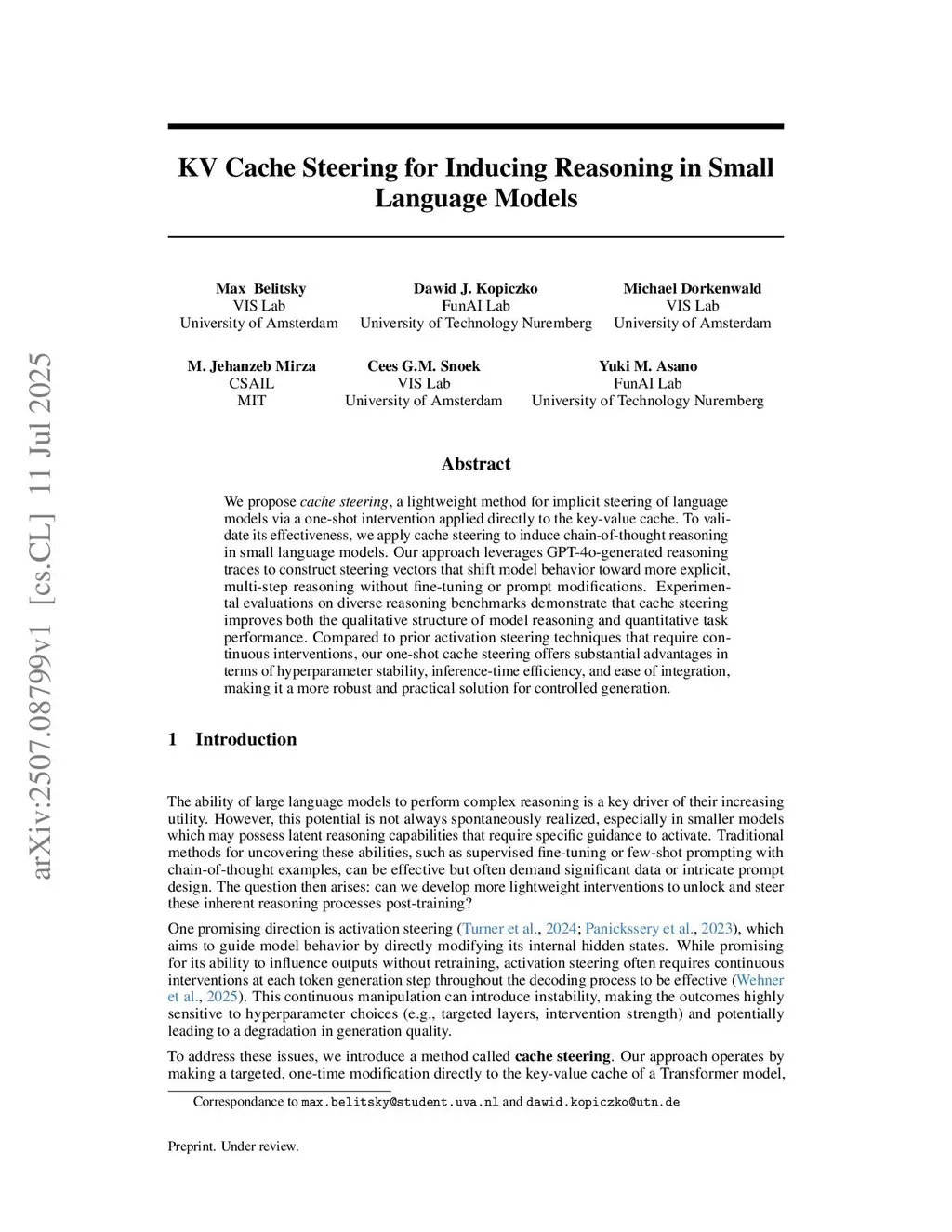 We propose cache steering, a lightweight method for implicit steering of language models via a one-shot intervention applied directly to the key-value cache. To validate its effectiveness, we apply cache steering to induce chain-of-thought reasoning in small language models. Our approach constructs steering vectors from reasoning traces, obtained either from teacher models (e.g., GPT-4o) or existing human annotations, that shift model behavior toward more explicit, multi-step reasoning without fine-tuning or prompt modifications. Experimental evaluations on diverse reasoning benchmarks demonstrate that cache steering improves both the qualitative structure of model reasoning and quantitative task performance. Additional experiments show that the method also scales to larger models and yields further gains on challenging datasets such as GPQA and MATH. Compared to prior activation steering techniques that require continuous interventions, our one-shot cache steering offers substantial advantages in terms of inference latency, hyperparameter stability, and ease of integration with existing inference APIs. Beyond mere reasoning induction, we show that cache steering enables controllable transfer of reasoning styles (e.g., stepwise, causal, analogical), making it a practical tool for behavior-level guidance of language models.