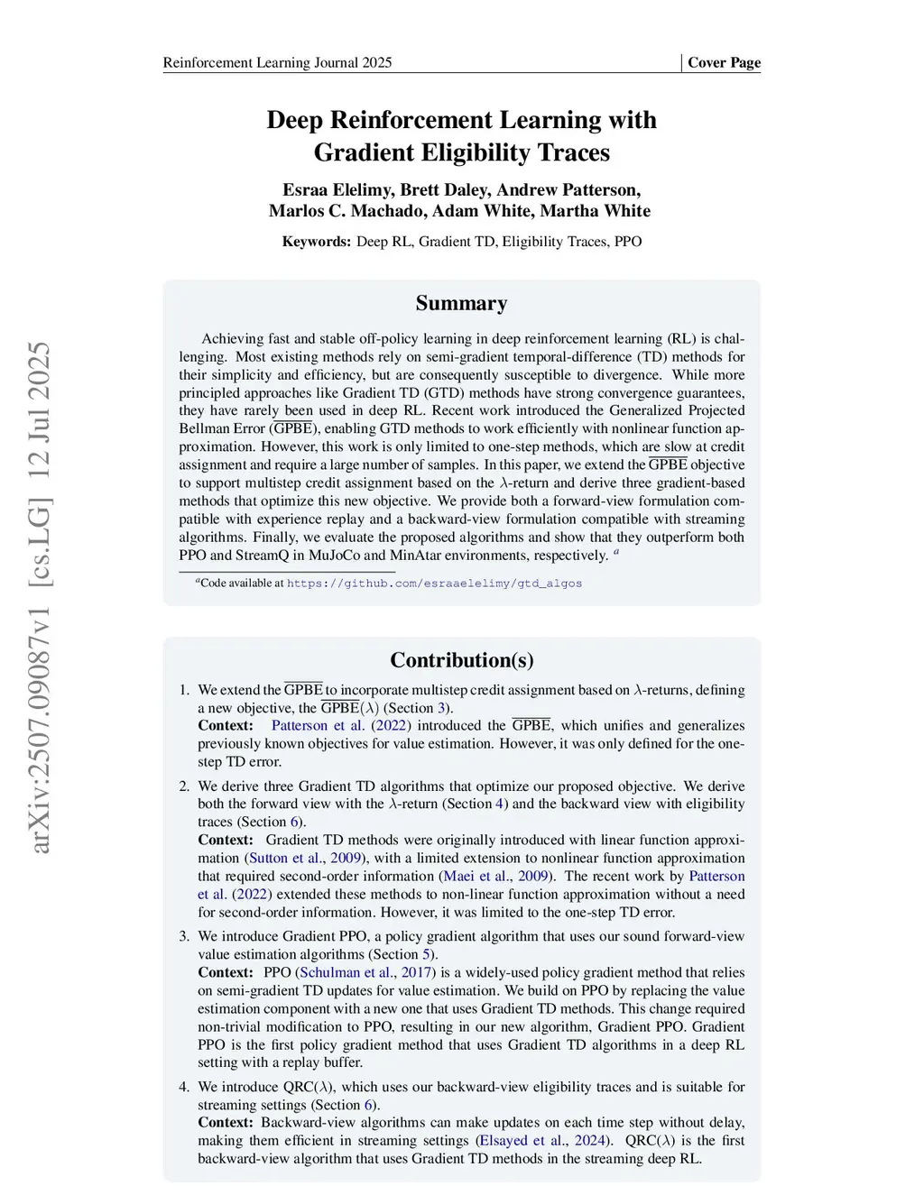 Achieving fast and stable off-policy learning in deep reinforcement learning (RL) is challenging. Most existing methods rely on semi-gradient temporal-difference (TD) methods for their simplicity and efficiency, but are consequently susceptible to divergence. While more principled approaches like Gradient TD (GTD) methods have strong convergence guarantees, they have rarely been used in deep RL. Recent work introduced the generalized Projected Bellman Error (), enabling GTD methods to work efficiently with nonlinear function approximation. However, this work is limited to one-step methods, which are slow at credit assignment and require a large number of samples. In this paper, we extend the generalized objective to support multistep credit assignment based on the -return and derive three gradient-based methods that optimize this new objective. We provide both a forward-view formulation compatible with experience replay and a backward-view formulation compatible with streaming algorithms. Finally, we evaluate the proposed algorithms and show that they outperform both PPO and StreamQ in MuJoCo and MinAtar environments, respectively. Code available atthis https URL\_algos