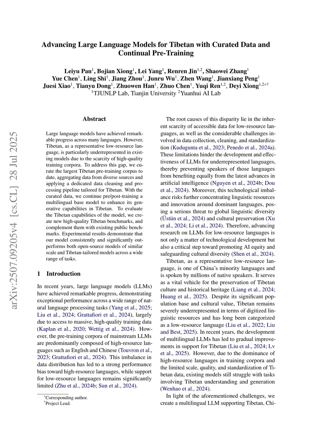 Large language models have achieved remarkable progress across many languages. However, Tibetan, as a representative low-resource language, is particularly underrepresented in existing models due to the scarcity of high-quality training corpora. To address this gap, we curate the largest Tibetan pre-training corpus to date, aggregating data from diverse sources and applying a dedicated data cleaning and processing pipeline tailored for Tibetan. With the curated data, we continue pre/post-training a multilingual base model to enhance its generative capabilities in Tibetan. To evaluate the Tibetan capabilities of the model, we create new high-quality Tibetan benchmarks, and complement them with existing public benchmarks. Experimental results demonstrate that our model consistently and significantly outperforms both open-source models of similar scale and Tibetan-tailored models across a wide range of tasks.
