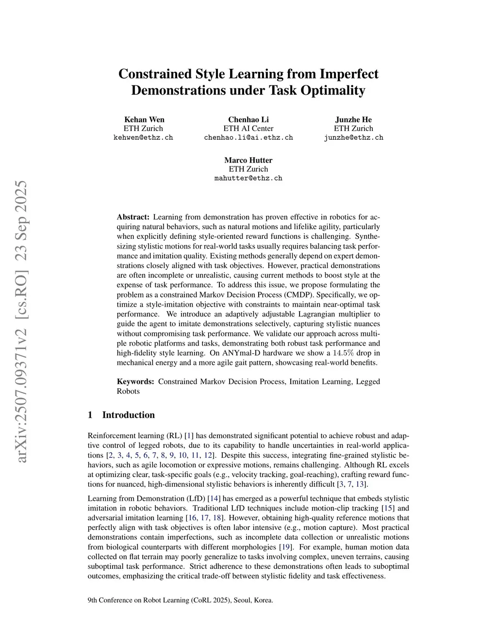 Learning from demonstration has proven effective in robotics for acquiring natural behaviors, such as stylistic motions and lifelike agility, particularly when explicitly defining style-oriented reward functions is challenging. Synthesizing stylistic motions for real-world tasks usually requires balancing task performance and imitation quality. Existing methods generally depend on expert demonstrations closely aligned with task objectives. However, practical demonstrations are often incomplete or unrealistic, causing current methods to boost style at the expense of task performance. To address this issue, we propose formulating the problem as a constrained Markov Decision Process (CMDP). Specifically, we optimize a style-imitation objective with constraints to maintain near-optimal task performance. We introduce an adaptively adjustable Lagrangian multiplier to guide the agent to imitate demonstrations selectively, capturing stylistic nuances without compromising task performance. We validate our approach across multiple robotic platforms and tasks, demonstrating both robust task performance and high-fidelity style learning. On ANYmal-D hardware we show a 14.5% drop in mechanical energy and a more agile gait pattern, showcasing real-world benefits.