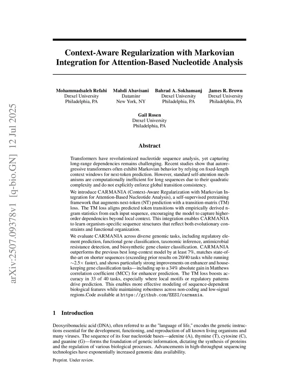 Transformers have revolutionized nucleotide sequence analysis, yet capturing long-range dependencies remains challenging. Recent studies show that autoregressive transformers often exhibit Markovian behavior by relying on fixed-length context windows for next-token prediction. However, standard self-attention mechanisms are computationally inefficient for long sequences due to their quadratic complexity and do not explicitly enforce global transition consistency.We introduce CARMANIA (Context-Aware Regularization with Markovian Integration for Attention-Based Nucleotide Analysis), a self-supervised pretraining framework that augments next-token (NT) prediction with a transition-matrix (TM) loss. The TM loss aligns predicted token transitions with empirically derived n-gram statistics from each input sequence, encouraging the model to capture higher-order dependencies beyond local context. This integration enables CARMANIA to learn organism-specific sequence structures that reflect both evolutionary constraints and functional organization.We evaluate CARMANIA across diverse genomic tasks, including regulatory element prediction, functional gene classification, taxonomic inference, antimicrobial resistance detection, and biosynthetic gene cluster classification. CARMANIA outperforms the previous best long-context model by at least 7 percent, matches state-of-the-art on shorter sequences (exceeding prior results on 20 out of 40 tasks while running approximately 2.5 times faster), and shows particularly strong improvements on enhancer and housekeeping gene classification tasks, including up to a 34 percent absolute gain in Matthews correlation coefficient (MCC) for enhancer prediction. The TM loss boosts accuracy in 33 of 40 tasks, especially where local motifs or regulatory patterns drive prediction.