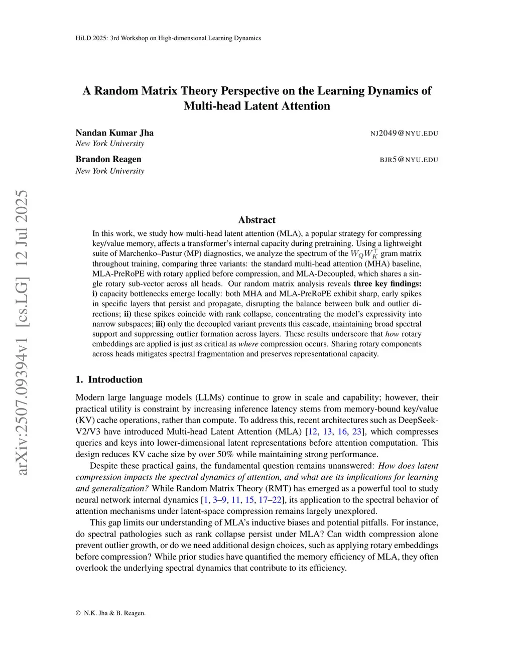 In this work, we study how multi-head latent attention (MLA), a popular strategy for compressing key/value memory, affects a transformer's internal capacity during pretraining. Using a lightweight suite of Marchenko-Pastur (MP) diagnostics, we analyze the spectrum of the gram matrix throughout training, comparing three variants: the standard multi-head attention (MHA) baseline, MLA-PreRoPE with rotary applied before compression, and MLA-Decoupled, which shares a single rotary sub-vector across all heads. Our random matrix analysis reveals \textbf{three key findings:} \textbf{ i)} capacity bottlenecks emerge locally: both MHA and MLA-PreRoPE exhibit sharp, early spikes in specific layers that persist and propagate, disrupting the balance between bulk and outlier directions; \textbf{ ii)} these spikes coincide with rank collapse, concentrating the model's expressivity into narrow subspaces; \textbf{ iii)} only the decoupled variant prevents this cascade, maintaining broad spectral support and suppressing outlier formation across layers. These results underscore that \emph{how} rotary embeddings are applied is just as critical as \emph{where} compression occurs. Sharing rotary components across heads mitigates spectral fragmentation and preserves representational capacity.