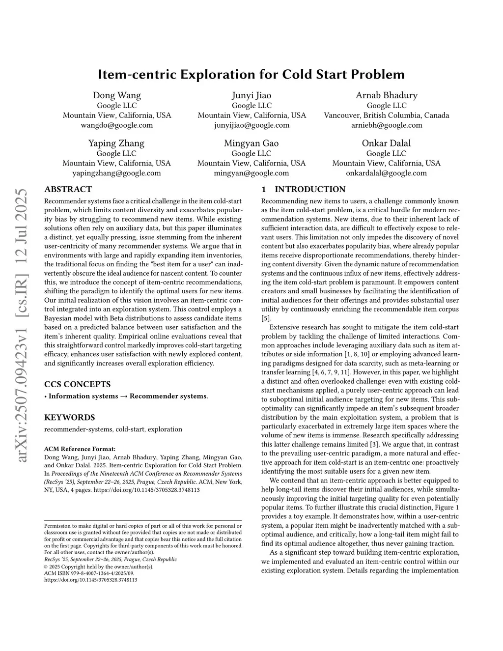 Recommender systems face a critical challenge in the item cold-start problem, which limits content diversity and exacerbates popularity bias by struggling to recommend new items. While existing solutions often rely on auxiliary data, but this paper illuminates a distinct, yet equally pressing, issue stemming from the inherent user-centricity of many recommender systems. We argue that in environments with large and rapidly expanding item inventories, the traditional focus on finding the "best item for a user" can inadvertently obscure the ideal audience for nascent content. To counter this, we introduce the concept of item-centric recommendations, shifting the paradigm to identify the optimal users for new items. Our initial realization of this vision involves an item-centric control integrated into an exploration system. This control employs a Bayesian model with Beta distributions to assess candidate items based on a predicted balance between user satisfaction and the item's inherent quality. Empirical online evaluations reveal that this straightforward control markedly improves cold-start targeting efficacy, enhances user satisfaction with newly explored content, and significantly increases overall exploration efficiency.