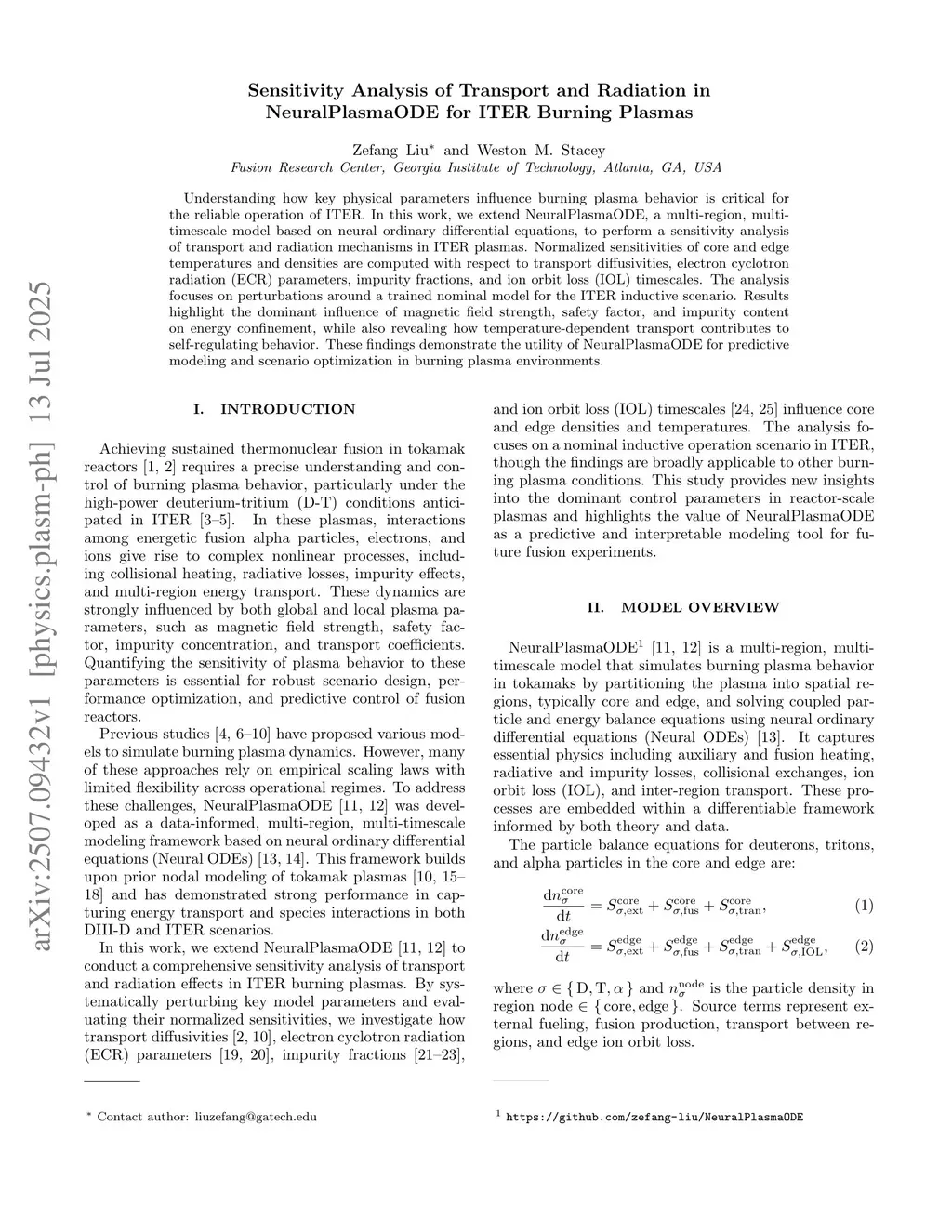 Understanding how key physical parameters influence burning plasma behavior is critical for the reliable operation of ITER. In this work, we extend NeuralPlasmaODE, a multi-region, multi-timescale model based on neural ordinary differential equations, to perform a sensitivity analysis of transport and radiation mechanisms in ITER plasmas. Normalized sensitivities of core and edge temperatures and densities are computed with respect to transport diffusivities, electron cyclotron radiation (ECR) parameters, impurity fractions, and ion orbit loss (IOL) timescales. The analysis focuses on perturbations around a trained nominal model for the ITER inductive scenario. Results highlight the dominant influence of magnetic field strength, safety factor, and impurity content on energy confinement, while also revealing how temperature-dependent transport contributes to self-regulating behavior. These findings demonstrate the utility of NeuralPlasmaODE for predictive modeling and scenario optimization in burning plasma environments.