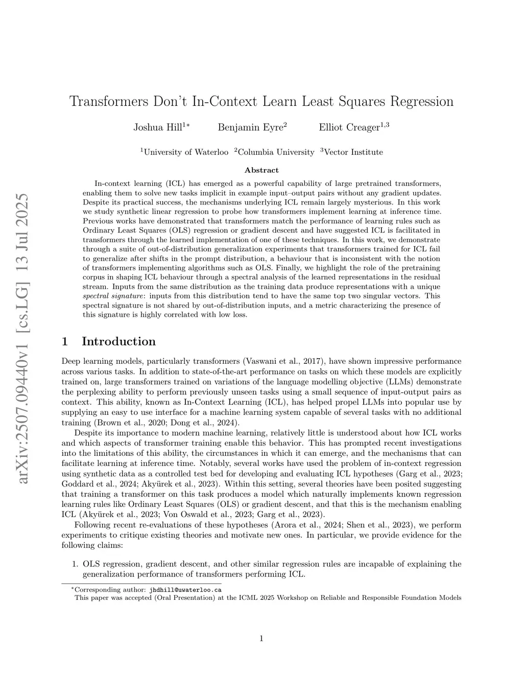 In-context learning (ICL) has emerged as a powerful capability of large pretrained transformers, enabling them to solve new tasks implicit in example input-output pairs without any gradient updates. Despite its practical success, the mechanisms underlying ICL remain largely mysterious. In this work we study synthetic linear regression to probe how transformers implement learning at inference time. Previous works have demonstrated that transformers match the performance of learning rules such as Ordinary Least Squares (OLS) regression or gradient descent and have suggested ICL is facilitated in transformers through the learned implementation of one of these techniques. In this work, we demonstrate through a suite of out-of-distribution generalization experiments that transformers trained for ICL fail to generalize after shifts in the prompt distribution, a behaviour that is inconsistent with the notion of transformers implementing algorithms such as OLS. Finally, we highlight the role of the pretraining corpus in shaping ICL behaviour through a spectral analysis of the learned representations in the residual stream. Inputs from the same distribution as the training data produce representations with a unique spectral signature: inputs from this distribution tend to have the same top two singular vectors. This spectral signature is not shared by out-of-distribution inputs, and a metric characterizing the presence of this signature is highly correlated with low loss.