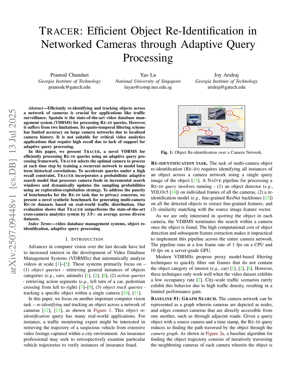 Efficiently re-identifying and tracking objects across a network of cameras is crucial for applications like traffic surveillance. Spatula is the state-of-the-art video database management system (VDBMS) for processing Re-ID queries. However, it suffers from two limitations. Its spatio-temporal filtering scheme has limited accuracy on large camera networks due to localized camera history. It is not suitable for critical video analytics applications that require high recall due to a lack of support for adaptive query processing.In this paper, we present Tracer, a novel VDBMS for efficiently processing Re-ID queries using an adaptive query processing framework. Tracer selects the optimal camera to process at each time step by training a recurrent network to model long-term historical correlations. To accelerate queries under a high recall constraint, Tracer incorporates a probabilistic adaptive search model that processes camera feeds in incremental search windows and dynamically updates the sampling probabilities using an exploration-exploitation strategy. To address the paucity of benchmarks for the Re-ID task due to privacy concerns, we present a novel synthetic benchmark for generating multi-camera Re-ID datasets based on real-world traffic distribution. Our evaluation shows that Tracer outperforms the state-of-the-art cross-camera analytics system by 3.9x on average across diverse datasets.