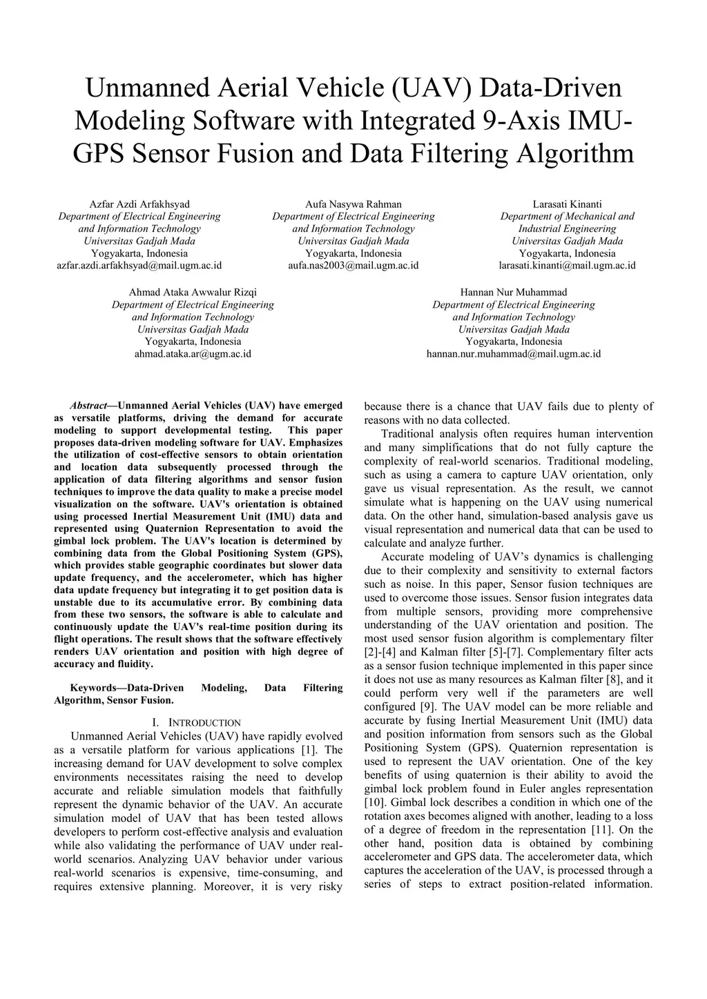 Unmanned Aerial Vehicle (UAV) Data-Driven Modeling Software with Integrated 9-Axis IMUGPS Sensor Fusion and Data Filtering Algorithm