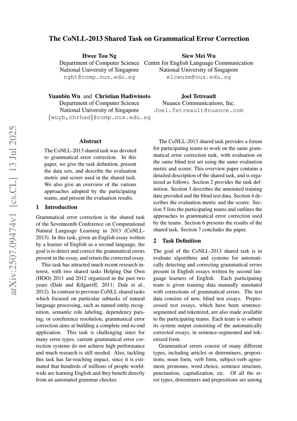 The CoNLL-2013 Shared Task on Grammatical Error Correction