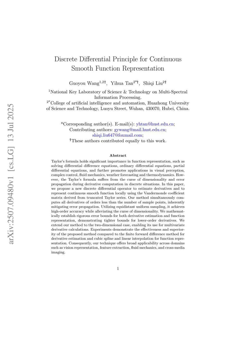 Taylor's formula holds significant importance in function representation, such as solving differential difference equations, ordinary differential equations, partial differential equations, and further promotes applications in visual perception, complex control, fluid mechanics, weather forecasting and thermodynamics. However, the Taylor's formula suffers from the curse of dimensionality and error propagation during derivative computation in discrete situations. In this paper, we propose a new discrete differential operator to estimate derivatives and to represent continuous smooth function locally using the Vandermonde coefficient matrix derived from truncated Taylor series. Our method simultaneously computes all derivatives of orders less than the number of sample points, inherently mitigating error propagation. Utilizing equidistant uniform sampling, it achieves high-order accuracy while alleviating the curse of dimensionality. We mathematically establish rigorous error bounds for both derivative estimation and function representation, demonstrating tighter bounds for lower-order derivatives. We extend our method to the two-dimensional case, enabling its use for multivariate derivative calculations. Experiments demonstrate the effectiveness and superiority of the proposed method compared to the finite forward difference method for derivative estimation and cubic spline and linear interpolation for function representation. Consequently, our technique offers broad applicability across domains such as vision representation, feature extraction, fluid mechanics, and cross-media imaging.