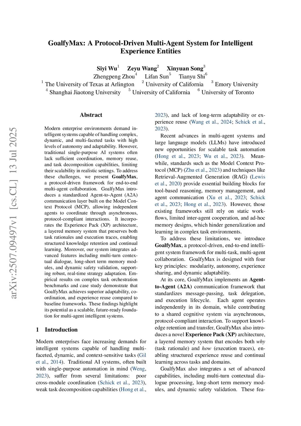 Modern enterprise environments demand intelligent systems capable of handling complex, dynamic, and multi-faceted tasks with high levels of autonomy and adaptability. However, traditional single-purpose AI systems often lack sufficient coordination, memory reuse, and task decomposition capabilities, limiting their scalability in realistic settings. To address these challenges, we present \textbf{GoalfyMax}, a protocol-driven framework for end-to-end multi-agent collaboration. GoalfyMax introduces a standardized Agent-to-Agent (A2A) communication layer built on the Model Context Protocol (MCP), allowing independent agents to coordinate through asynchronous, protocol-compliant interactions. It incorporates the Experience Pack (XP) architecture, a layered memory system that preserves both task rationales and execution traces, enabling structured knowledge retention and continual learning. Moreover, our system integrates advanced features including multi-turn contextual dialogue, long-short term memory modules, and dynamic safety validation, supporting robust, real-time strategy adaptation. Empirical results on complex task orchestration benchmarks and case study demonstrate that GoalfyMax achieves superior adaptability, coordination, and experience reuse compared to baseline frameworks. These findings highlight its potential as a scalable, future-ready foundation for multi-agent intelligent systems.
