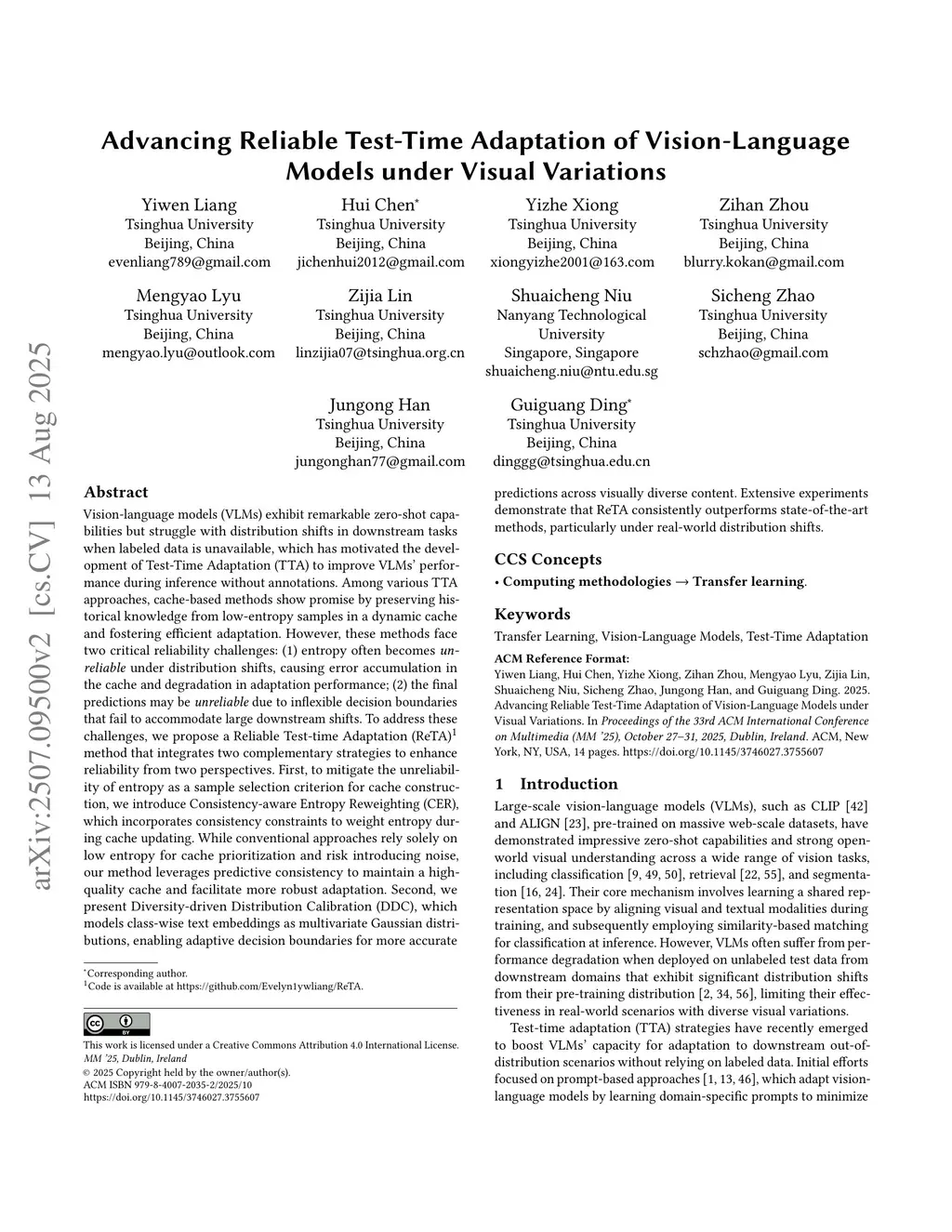 Vision-language models (VLMs) exhibit remarkable zero-shot capabilities but struggle with distribution shifts in downstream tasks when labeled data is unavailable, which has motivated the development of Test-Time Adaptation (TTA) to improve VLMs' performance during inference without annotations. Among various TTA approaches, cache-based methods show promise by preserving historical knowledge from low-entropy samples in a dynamic cache and fostering efficient adaptation. However, these methods face two critical reliability challenges: (1) entropy often becomes unreliable under distribution shifts, causing error accumulation in the cache and degradation in adaptation performance; (2) the final predictions may be unreliable due to inflexible decision boundaries that fail to accommodate large downstream shifts. To address these challenges, we propose a Reliable Test-time Adaptation (ReTA) method that integrates two complementary strategies to enhance reliability from two perspectives. First, to mitigate the unreliability of entropy as a sample selection criterion for cache construction, we introduce Consistency-aware Entropy Reweighting (CER), which incorporates consistency constraints to weight entropy during cache updating. While conventional approaches rely solely on low entropy for cache prioritization and risk introducing noise, our method leverages predictive consistency to maintain a high-quality cache and facilitate more robust adaptation. Second, we present Diversity-driven Distribution Calibration (DDC), which models class-wise text embeddings as multivariate Gaussian distributions, enabling adaptive decision boundaries for more accurate predictions across visually diverse content. Extensive experiments demonstrate that ReTA consistently outperforms state-of-the-art methods, particularly under real-world distribution shifts. Code:this https URL.