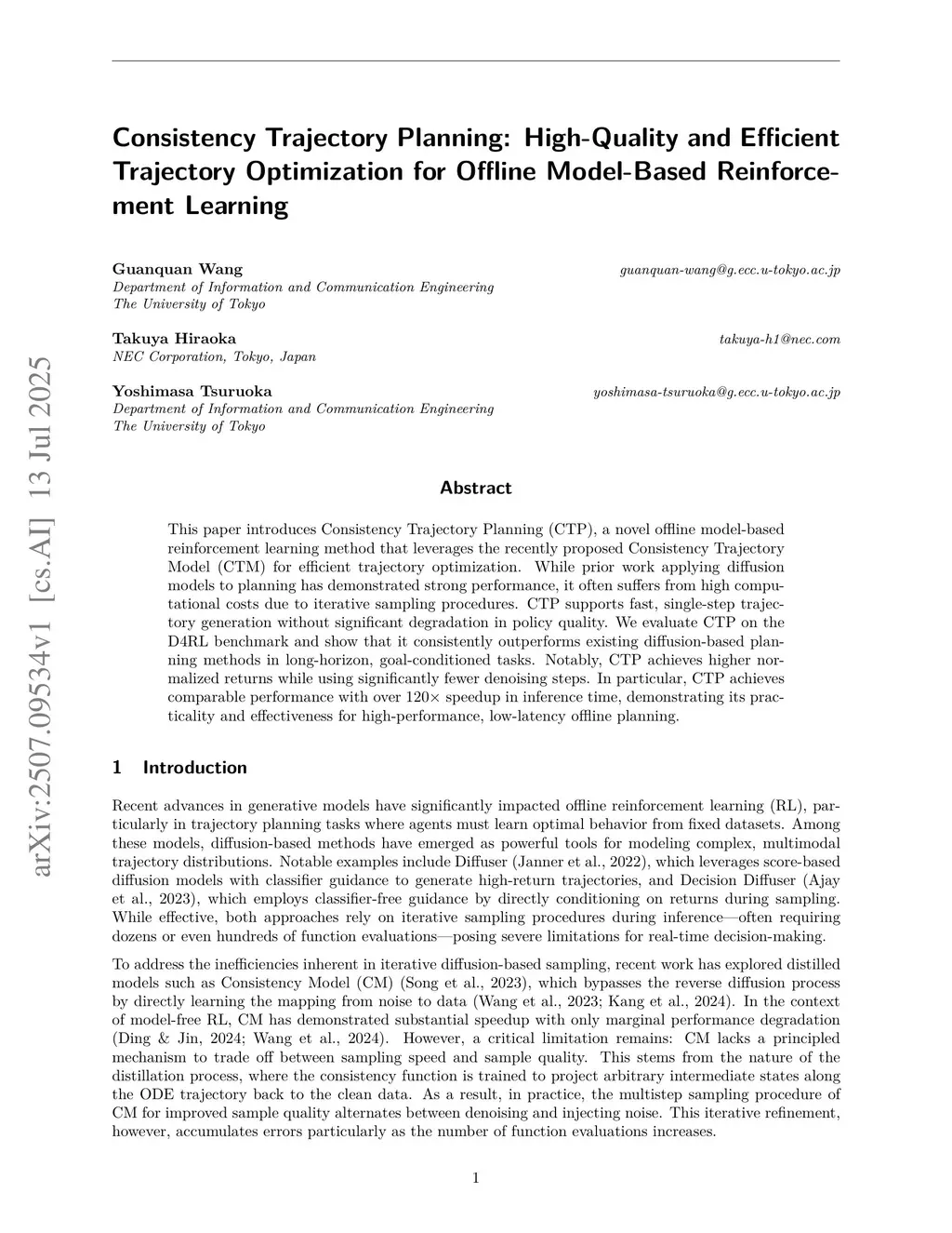 This paper introduces Consistency Trajectory Planning (CTP), a novel offline model-based reinforcement learning method that leverages the recently proposed Consistency Trajectory Model (CTM) for efficient trajectory optimization. While prior work applying diffusion models to planning has demonstrated strong performance, it often suffers from high computational costs due to iterative sampling procedures. CTP supports fast, single-step trajectory generation without significant degradation in policy quality. We evaluate CTP on the D4RL benchmark and show that it consistently outperforms existing diffusion-based planning methods in long-horizon, goal-conditioned tasks. Notably, CTP achieves higher normalized returns while using significantly fewer denoising steps. In particular, CTP achieves comparable performance with over speedup in inference time, demonstrating its practicality and effectiveness for high-performance, low-latency offline planning.