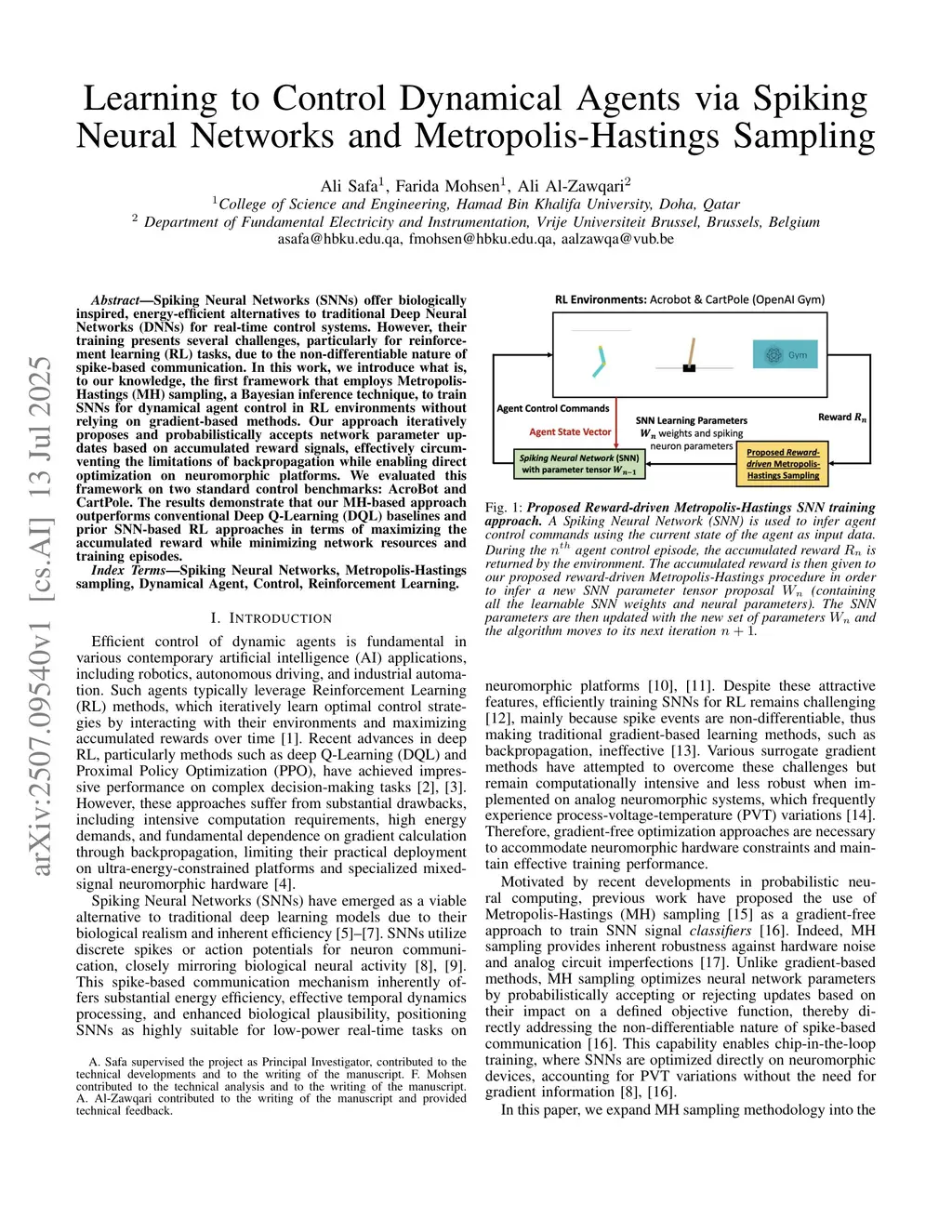 Learning to Control Dynamical Agents via Spiking Neural Networks and Metropolis-Hastings Sampling