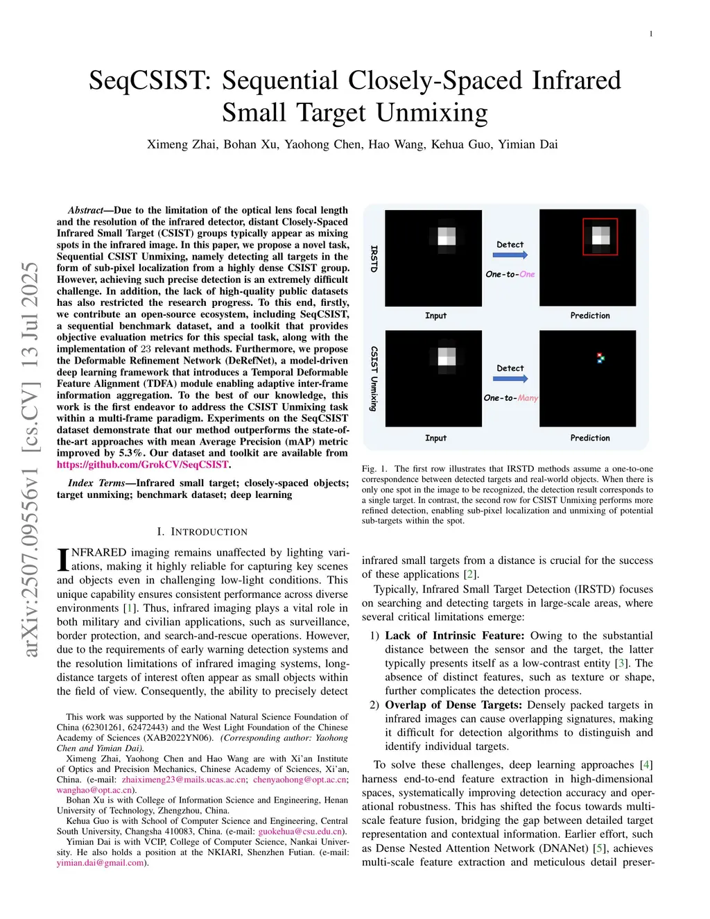Due to the limitation of the optical lens focal length and the resolution of the infrared detector, distant Closely-Spaced Infrared Small Target (CSIST) groups typically appear as mixing spots in the infrared image. In this paper, we propose a novel task, Sequential CSIST Unmixing, namely detecting all targets in the form of sub-pixel localization from a highly dense CSIST group. However, achieving such precise detection is an extremely difficult challenge. In addition, the lack of high-quality public datasets has also restricted the research progress. To this end, firstly, we contribute an open-source ecosystem, including SeqCSIST, a sequential benchmark dataset, and a toolkit that provides objective evaluation metrics for this special task, along with the implementation of 23 relevant methods. Furthermore, we propose the Deformable Refinement Network (DeRefNet), a model-driven deep learning framework that introduces a Temporal Deformable Feature Alignment (TDFA) module enabling adaptive inter-frame information aggregation. To the best of our knowledge, this work is the first endeavor to address the CSIST Unmixing task within a multi-frame paradigm. Experiments on the SeqCSIST dataset demonstrate that our method outperforms the state-of-the-art approaches with mean Average Precision (mAP) metric improved by 5.3\%. Our dataset and toolkit are available fromthis https URL.