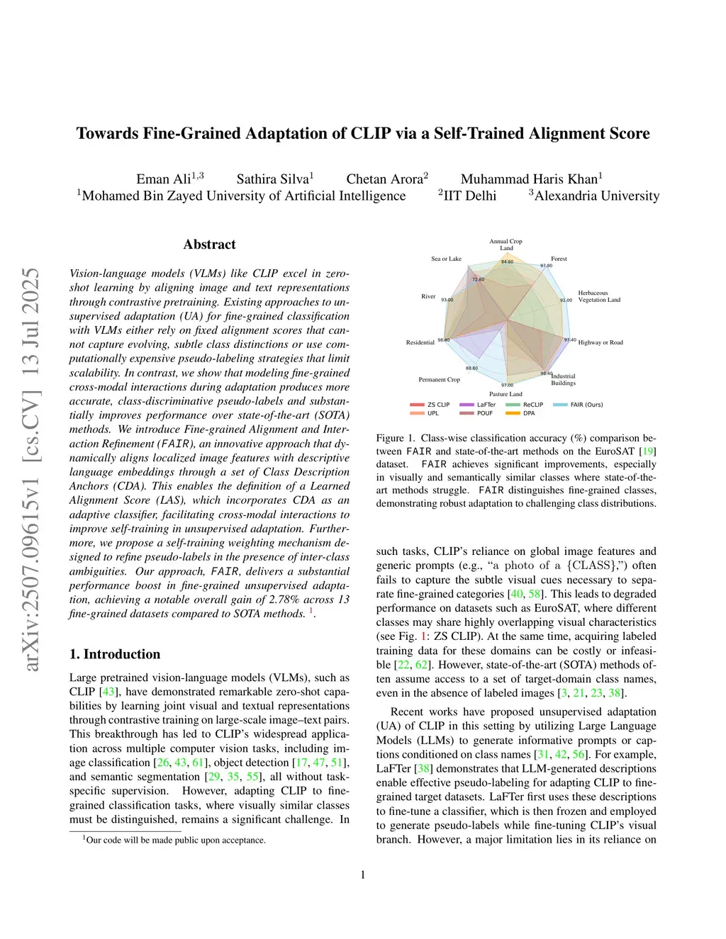 Vision-language models (VLMs) like CLIP excel in zero-shot learning by aligning image and text representations through contrastive pretraining. Existing approaches to unsupervised adaptation (UA) for fine-grained classification with VLMs either rely on fixed alignment scores that cannot capture evolving, subtle class distinctions or use computationally expensive pseudo-labeling strategies that limit scalability. In contrast, we show that modeling fine-grained cross-modal interactions during adaptation produces more accurate, class-discriminative pseudo-labels and substantially improves performance over state-of-the-art (SOTA) methods. We introduce Fine-grained Alignment and Interaction Refinement (FAIR), an innovative approach that dynamically aligns localized image features with descriptive language embeddings through a set of Class Description Anchors (CDA). This enables the definition of a Learned Alignment Score (LAS), which incorporates CDA as an adaptive classifier, facilitating cross-modal interactions to improve self-training in unsupervised adaptation. Furthermore, we propose a self-training weighting mechanism designed to refine pseudo-labels in the presence of inter-class ambiguities. Our approach, FAIR, delivers a substantial performance boost in fine-grained unsupervised adaptation, achieving a notable overall gain of 2.78% across 13 fine-grained datasets compared to SOTA methods.