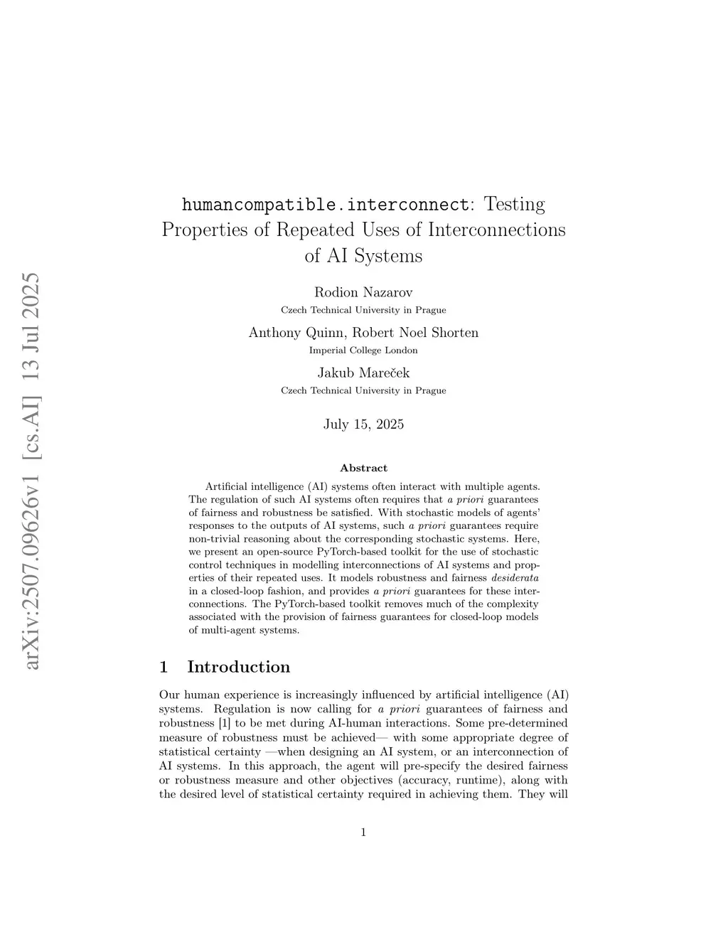 Artificial intelligence (AI) systems often interact with multiple agents. The regulation of such AI systems often requires that {\em a priori\/} guarantees of fairness and robustness be satisfied. With stochastic models of agents' responses to the outputs of AI systems, such {\em a priori\/} guarantees require non-trivial reasoning about the corresponding stochastic systems. Here, we present an open-source PyTorch-based toolkit for the use of stochastic control techniques in modelling interconnections of AI systems and properties of their repeated uses. It models robustness and fairness desiderata in a closed-loop fashion, and provides {\em a priori\/} guarantees for these interconnections. The PyTorch-based toolkit removes much of the complexity associated with the provision of fairness guarantees for closed-loop models of multi-agent systems.