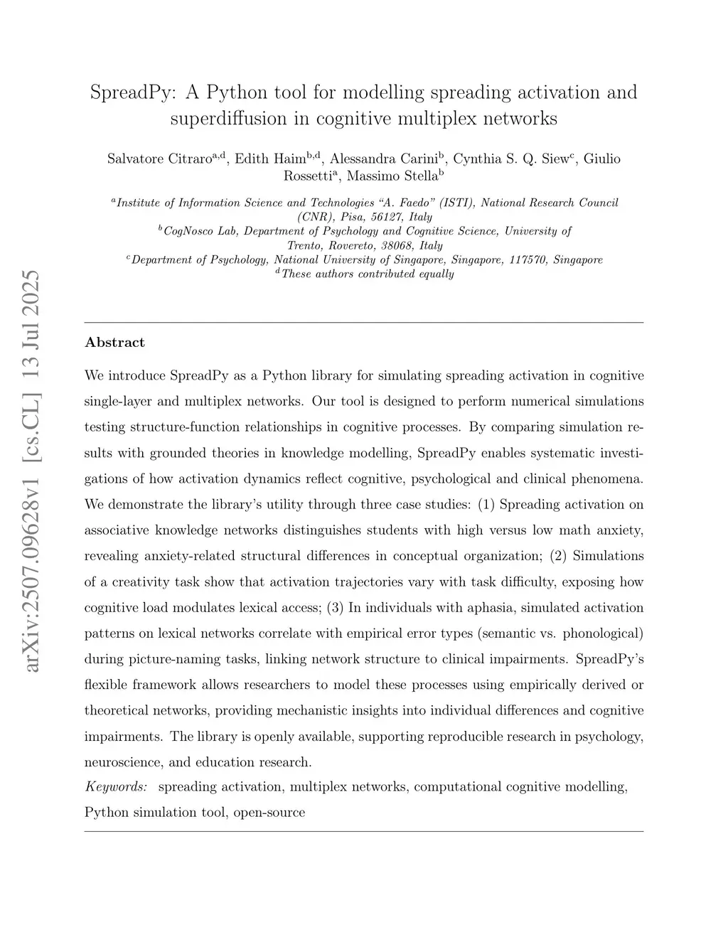 SpreadPy: A Python tool for modelling spreading activation and superdiffusion in cognitive multiplex networks