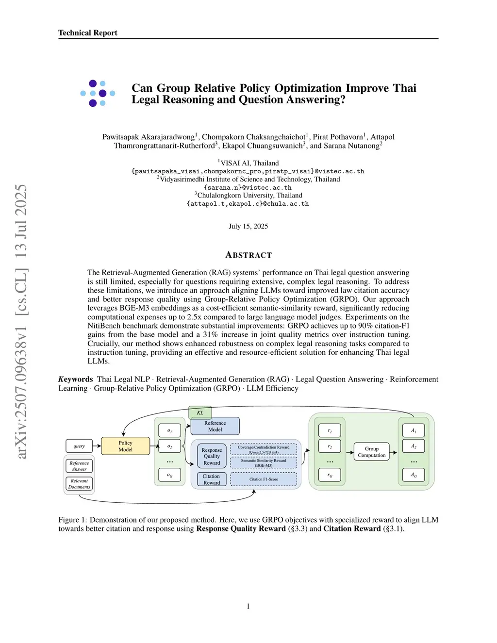 The Retrieval-Augmented Generation (RAG) systems' performance on Thai legal question answering is still limited, especially for questions requiring extensive, complex legal reasoning. To address these limitations, we introduce an approach aligning LLMs toward improved law citation accuracy and better response quality using Group-Relative Policy Optimization (GRPO). Our approach leverages BGE-M3 embeddings as a cost-efficient semantic-similarity reward, significantly reducing computational expenses up to 2.5x compared to large language model judges. Experiments on the NitiBench benchmark demonstrate substantial improvements: GRPO achieves up to 90% citation-F1 gains from the base model and a 31% increase in joint quality metrics over instruction tuning. Crucially, our method shows enhanced robustness on complex legal reasoning tasks compared to instruction tuning, providing an effective and resource-efficient solution for enhancing Thai legal LLMs.