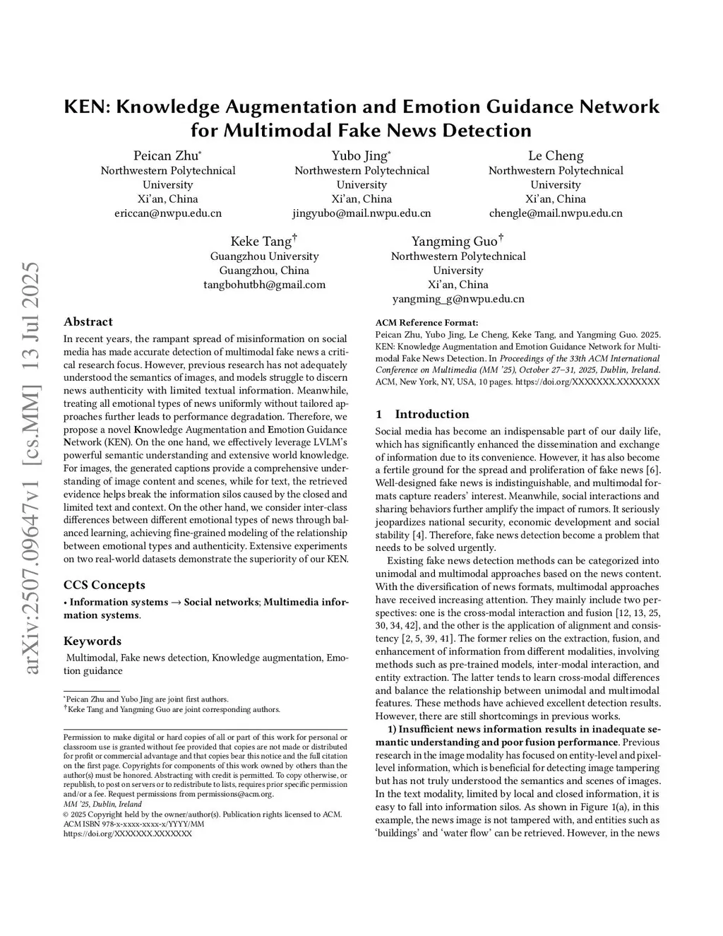 KEN: Knowledge Augmentation and Emotion Guidance Network for Multimodal Fake News Detection