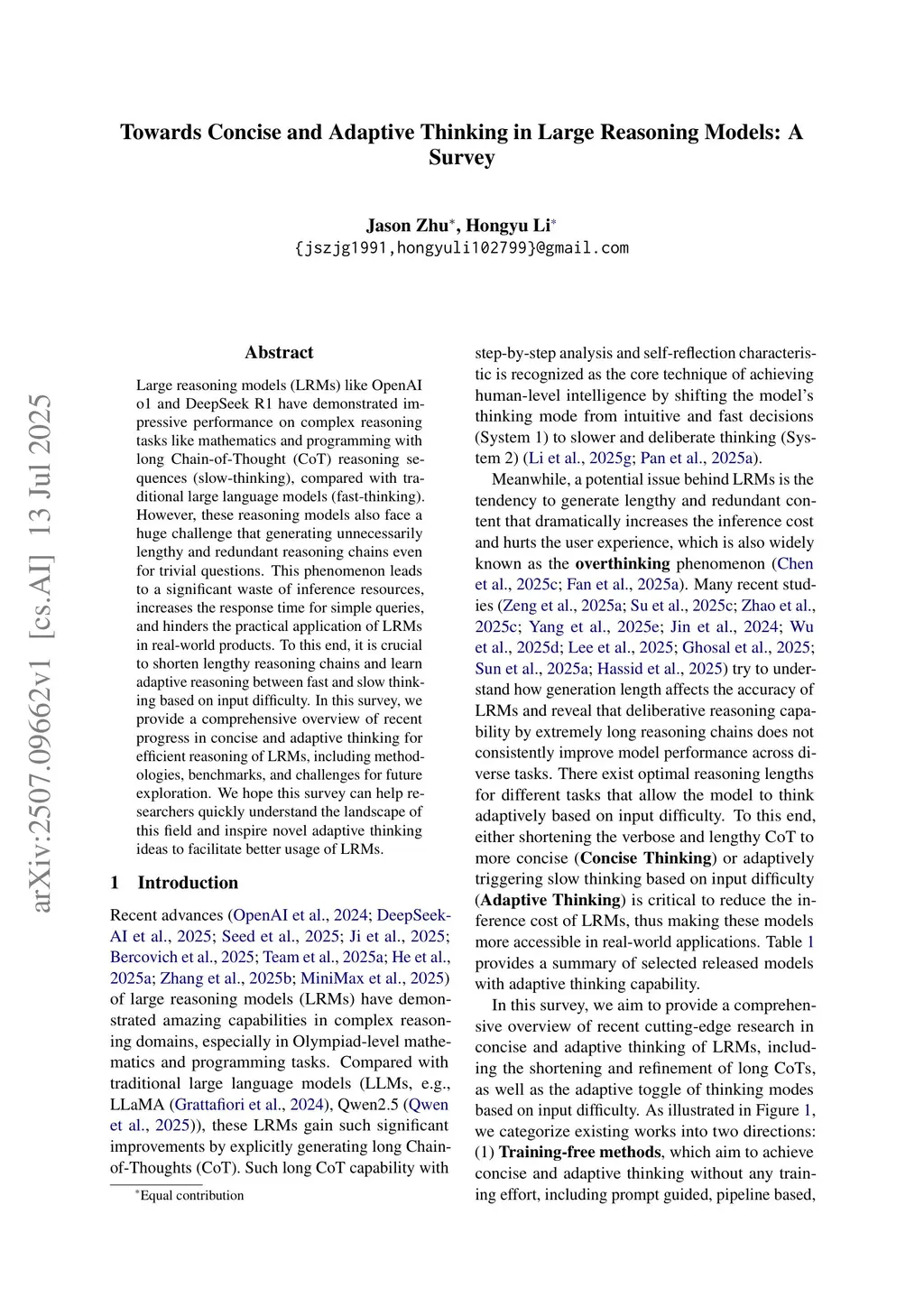 Large reasoning models (LRMs) like OpenAI o1 and DeepSeek R1 have demonstrated impressive performance on complex reasoning tasks like mathematics and programming with long Chain-of-Thought (CoT) reasoning sequences (slow-thinking), compared with traditional large language models (fast-thinking). However, these reasoning models also face a huge challenge that generating unnecessarily lengthy and redundant reasoning chains even for trivial questions. This phenomenon leads to a significant waste of inference resources, increases the response time for simple queries, and hinders the practical application of LRMs in real-world products. To this end, it is crucial to shorten lengthy reasoning chains and learn adaptive reasoning between fast and slow thinking based on input difficulty. In this survey, we provide a comprehensive overview of recent progress in concise and adaptive thinking for efficient reasoning of LRMs, including methodologies, benchmarks, and challenges for future exploration. We hope this survey can help researchers quickly understand the landscape of this field and inspire novel adaptive thinking ideas to facilitate better usage of LRMs.
