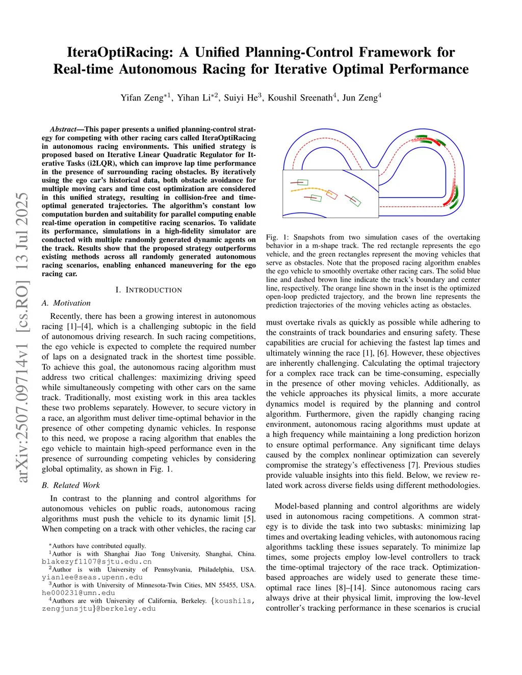 This paper presents a unified planning-control strategy for competing with other racing cars called IteraOptiRacing in autonomous racing environments. This unified strategy is proposed based on Iterative Linear Quadratic Regulator for Iterative Tasks (i2LQR), which can improve lap time performance in the presence of surrounding racing obstacles. By iteratively using the ego car's historical data, both obstacle avoidance for multiple moving cars and time cost optimization are considered in this unified strategy, resulting in collision-free and time-optimal generated trajectories. The algorithm's constant low computation burden and suitability for parallel computing enable real-time operation in competitive racing scenarios. To validate its performance, simulations in a high-fidelity simulator are conducted with multiple randomly generated dynamic agents on the track. Results show that the proposed strategy outperforms existing methods across all randomly generated autonomous racing scenarios, enabling enhanced maneuvering for the ego racing car.