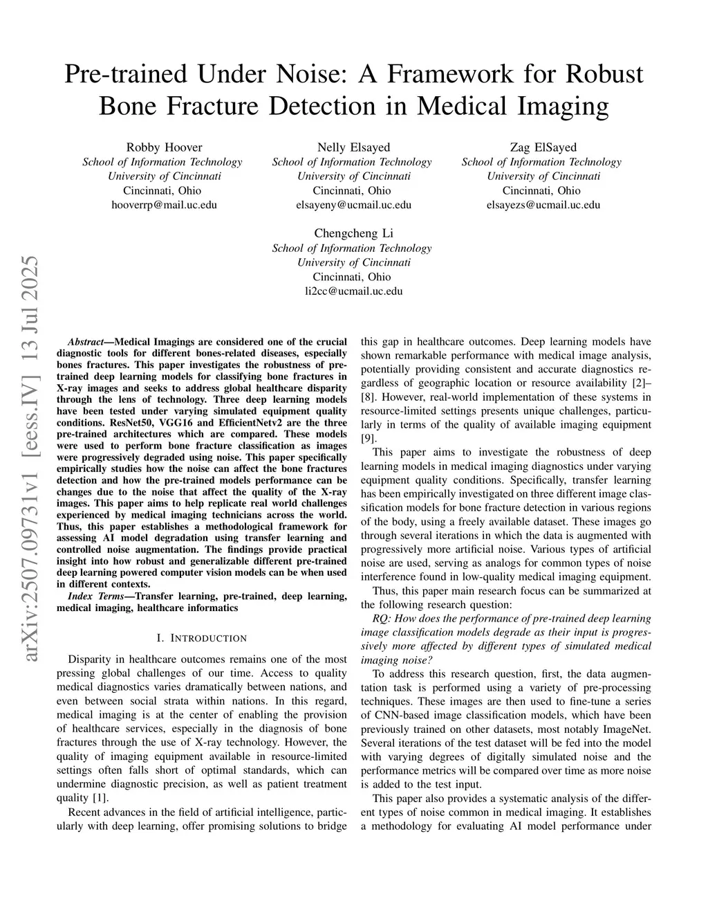 Medical Imagings are considered one of the crucial diagnostic tools for different bones-related diseases, especially bones fractures. This paper investigates the robustness of pre-trained deep learning models for classifying bone fractures in X-ray images and seeks to address global healthcare disparity through the lens of technology. Three deep learning models have been tested under varying simulated equipment quality conditions. ResNet50, VGG16 and EfficientNetv2 are the three pre-trained architectures which are compared. These models were used to perform bone fracture classification as images were progressively degraded using noise. This paper specifically empirically studies how the noise can affect the bone fractures detection and how the pre-trained models performance can be changes due to the noise that affect the quality of the X-ray images. This paper aims to help replicate real world challenges experienced by medical imaging technicians across the world. Thus, this paper establishes a methodological framework for assessing AI model degradation using transfer learning and controlled noise augmentation. The findings provide practical insight into how robust and generalizable different pre-trained deep learning powered computer vision models can be when used in different contexts.