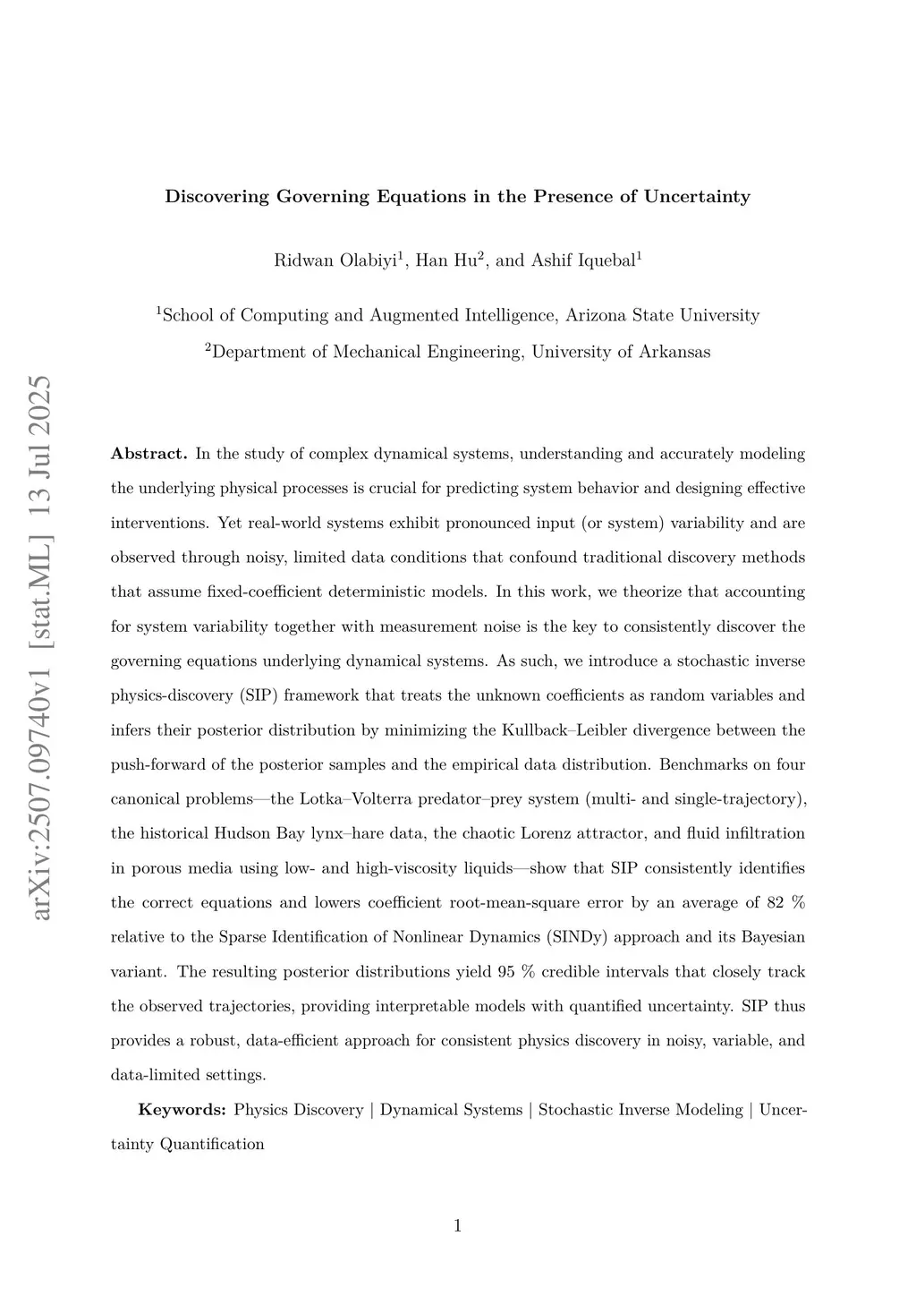 In the study of complex dynamical systems, understanding and accurately modeling the underlying physical processes is crucial for predicting system behavior and designing effective interventions. Yet real-world systems exhibit pronounced input (or system) variability and are observed through noisy, limited data conditions that confound traditional discovery methods that assume fixed-coefficient deterministic models. In this work, we theorize that accounting for system variability together with measurement noise is the key to consistently discover the governing equations underlying dynamical systems. As such, we introduce a stochastic inverse physics-discovery (SIP) framework that treats the unknown coefficients as random variables and infers their posterior distribution by minimizing the Kullback-Leibler divergence between the push-forward of the posterior samples and the empirical data distribution. Benchmarks on four canonical problems -- the Lotka-Volterra predator-prey system (multi- and single-trajectory), the historical Hudson Bay lynx-hare data, the chaotic Lorenz attractor, and fluid infiltration in porous media using low- and high-viscosity liquids -- show that SIP consistently identifies the correct equations and lowers coefficient root-mean-square error by an average of 82\% relative to the Sparse Identification of Nonlinear Dynamics (SINDy) approach and its Bayesian variant. The resulting posterior distributions yield 95\% credible intervals that closely track the observed trajectories, providing interpretable models with quantified uncertainty. SIP thus provides a robust, data-efficient approach for consistent physics discovery in noisy, variable, and data-limited settings.